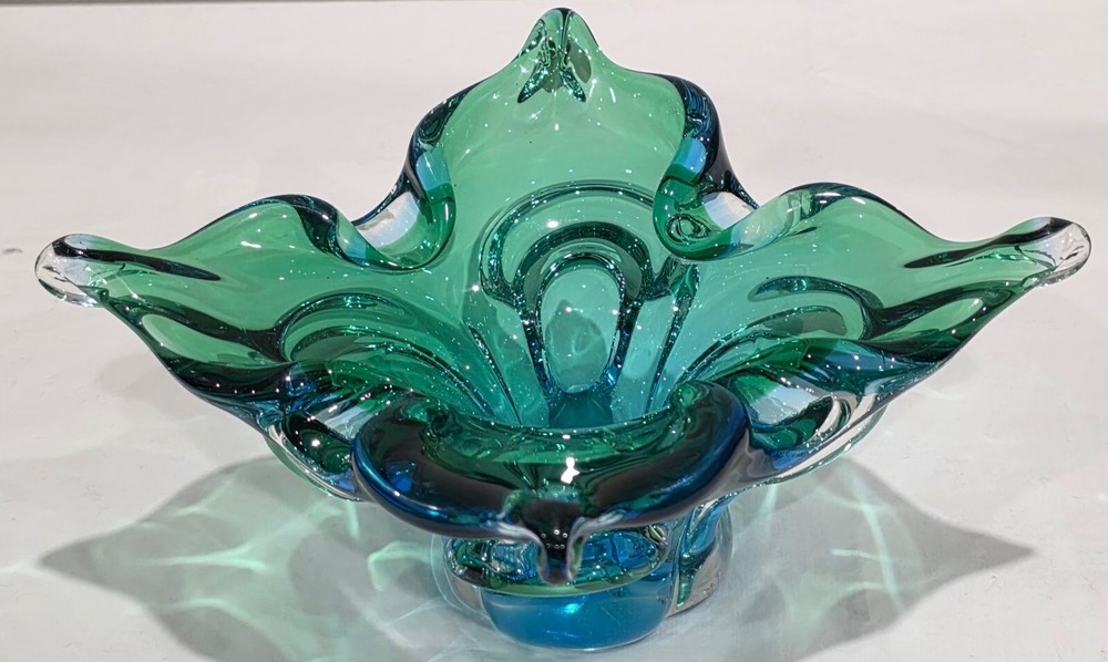 VINTAGE MCM TEAL BLUE / GREEN FREEFORM ART GLASS ASHTRAY / TRINKET BOWL UNSIGNED BUT BELIEVED TO BE CHALET LORRAINE MEASURES ABOUT 6.5" SQUARE x 3.75" HIGH VERY GOOD CONDITION WITH NO CHIPS, CRACKS OR REPAIRS