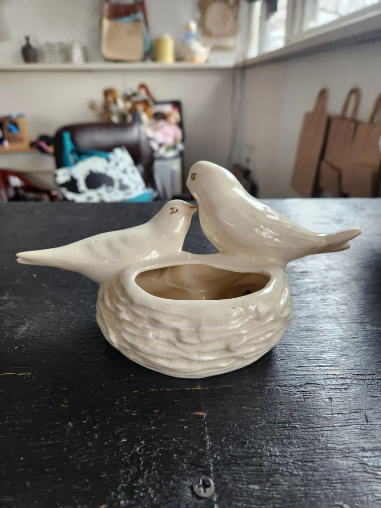 Vintage McCoy Lovebirds planter is a ceramic art pottery piece featuring a white color with a charming bird design. This planter was produced using traditional pottery techniques by McCoy.