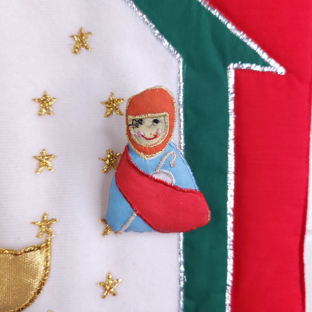 No holes or stains. Some loose threads (see photos). Missing 5 figures. White felt and hook-and-loop backing allows placing figures in a nativity scene. Measures approximately 29.5 inches by 14.5 inches.