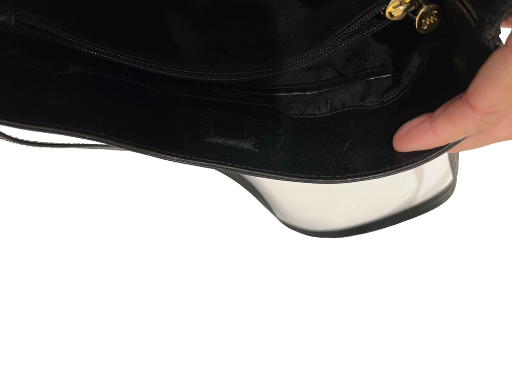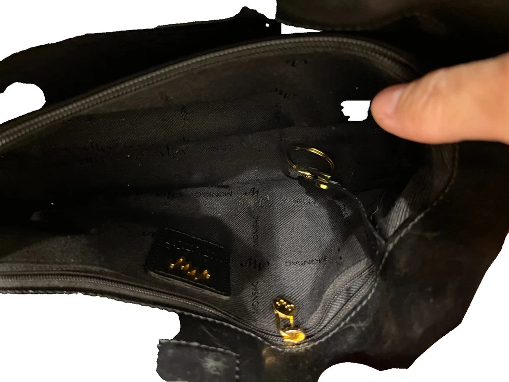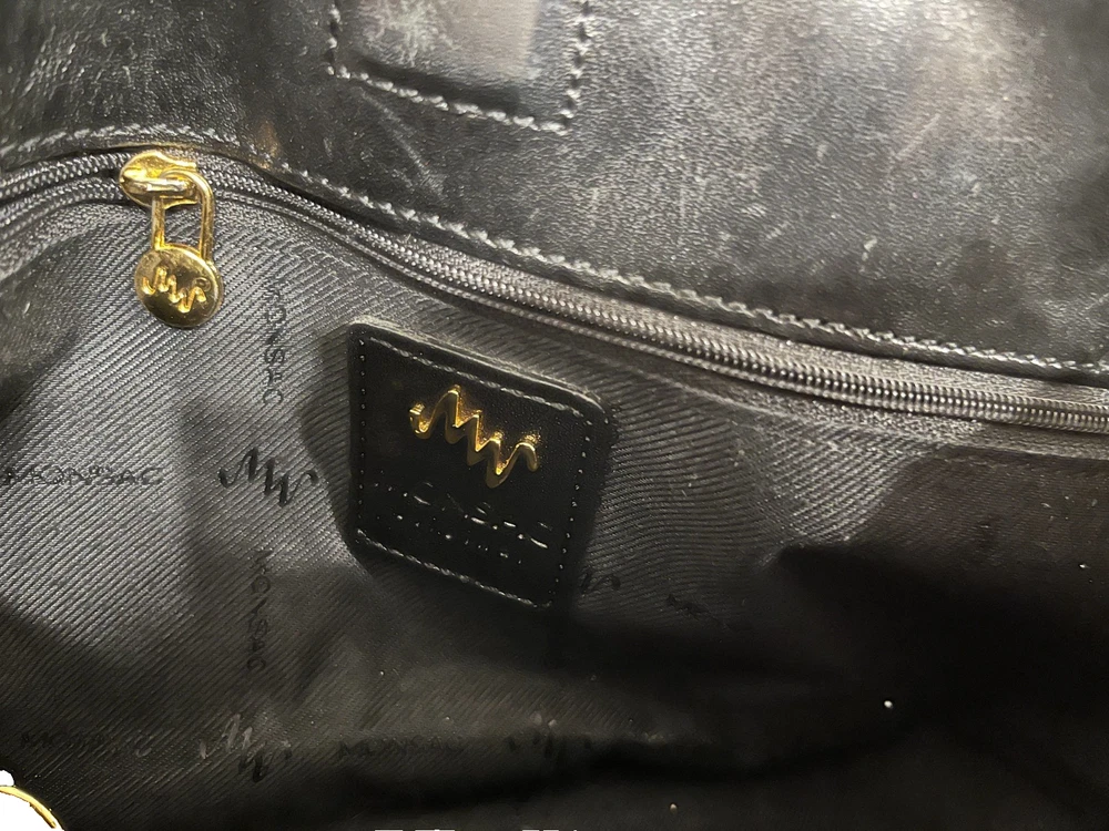 The Vintage MONSAC Black Leather Shoulder Bag Tote Purse is a stylish and classic accessory for women. Made in the United States with high-quality leather, this rectangular-shaped bag features a solid black exterior with silver hardware accents. The double handles, medium size, and inner pockets make it versatile for travel, casual outings, and business purposes. With a zip and magnetic closure, this bag is both functional and fashionable, perfect for adding a timeless touch to any outfit.