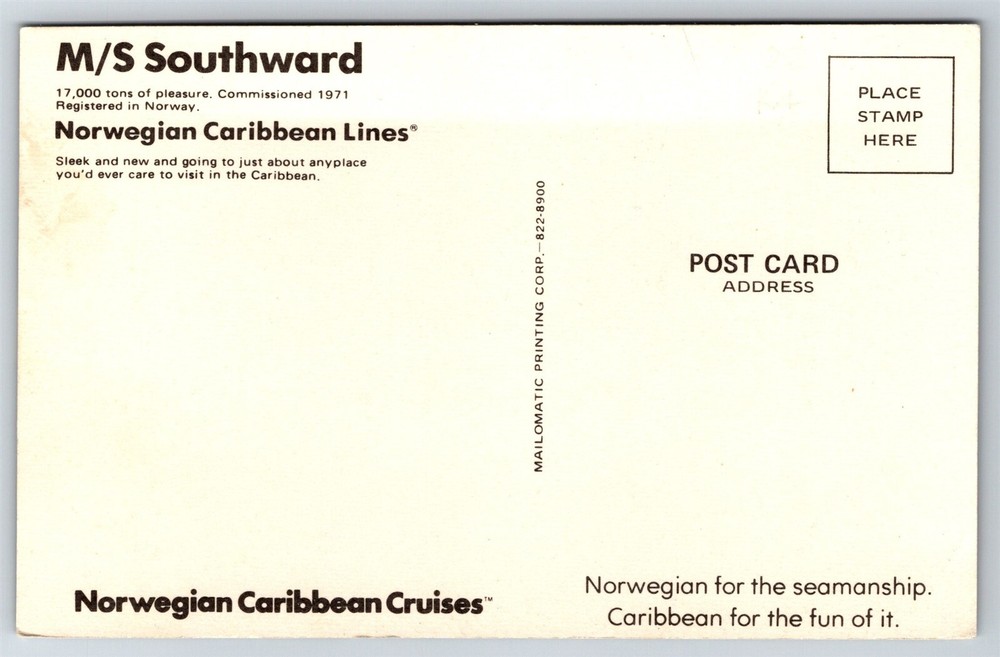 M/S Southward Norwegian Caribbean Lines Cruise Postcard R14 Thank you for visiting! This is a standard size postcard, 3.5" X 5.5". Packaged in a sleeve for protection. In stock, usually ships within 24 hours of your purchase. Please ask questions if you are unsure about anything. My goal is for your complete satisfaction with the postcard and your experience. I have over 10,000 selections in my store. Check it out here RETIREDWITHBOOKS Powered by SixBit's eCommerce Solution