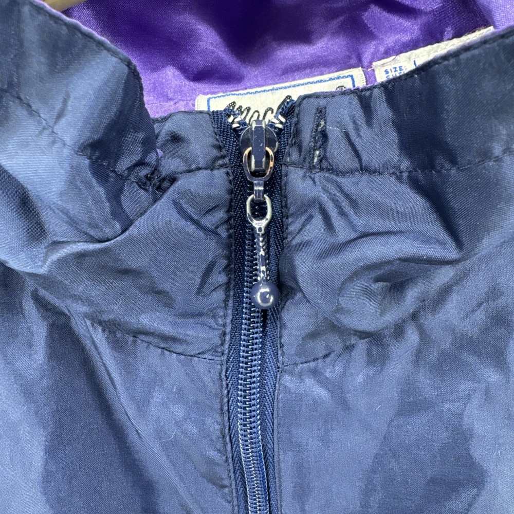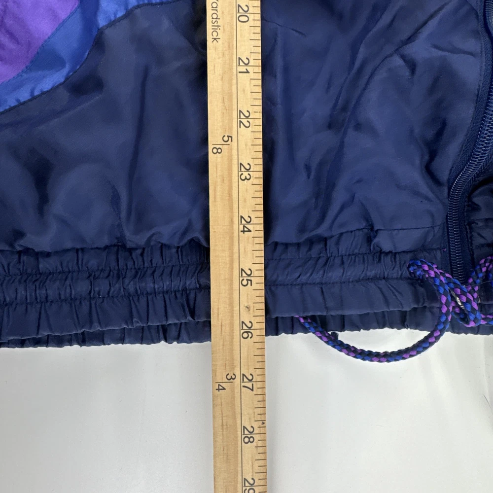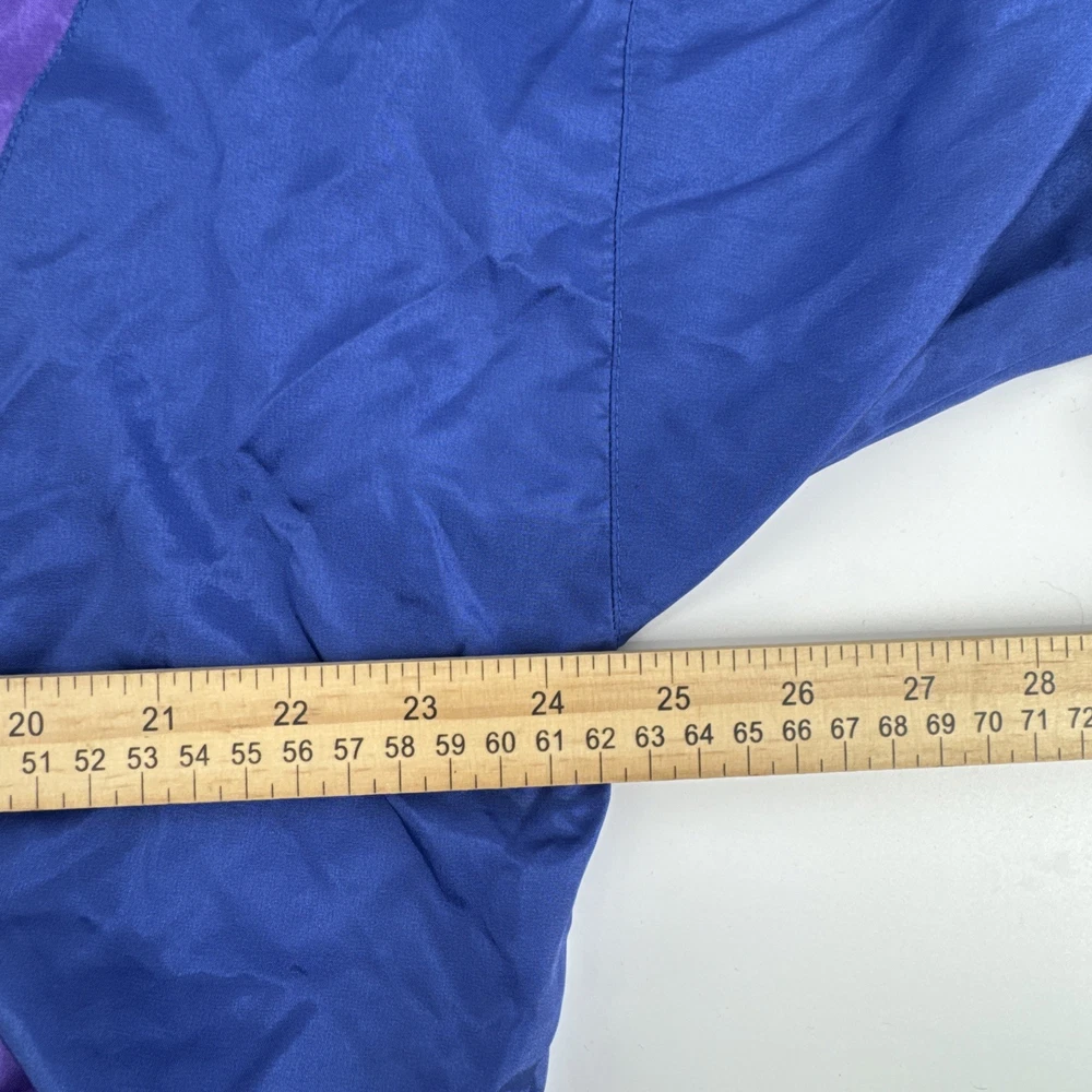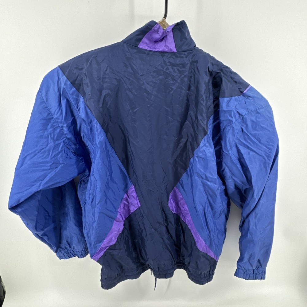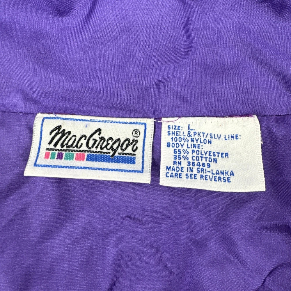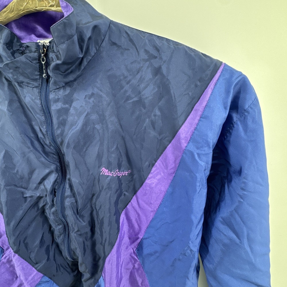 The Vintage MacGregor Jacket is a stylish retro piece perfect for men looking for a bold and unique addition to their wardrobe. Made from durable nylon outer shell material and lined with cozy polyester, this colorblock design in blue with purple and teal accents offers a relaxed fit for a comfortable wear. A full zip closure and elastic waist make it practical for outdoor activities, while the lightweight construction and pockets add convenience. Whether you're looking to channel your 80s or 90s style or simply want a sporty windbreaker for winter, fall, or spring, this jacket is a versatile choice with a touch of nostalgia.