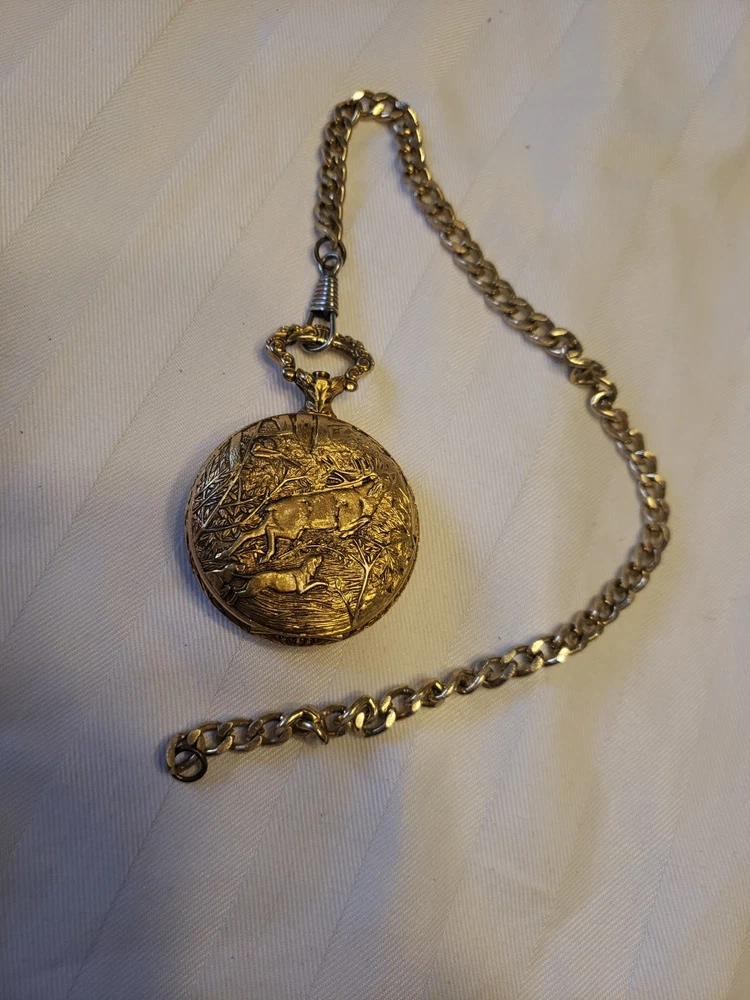 Missing the wind up knob-makes it difficultto open to see clock face. Has gold tone. See pictures. What you see is what you get .please message me if you have any questions. Thank you and God bless. Bin#20