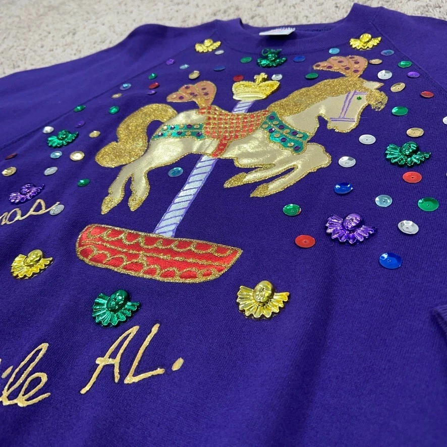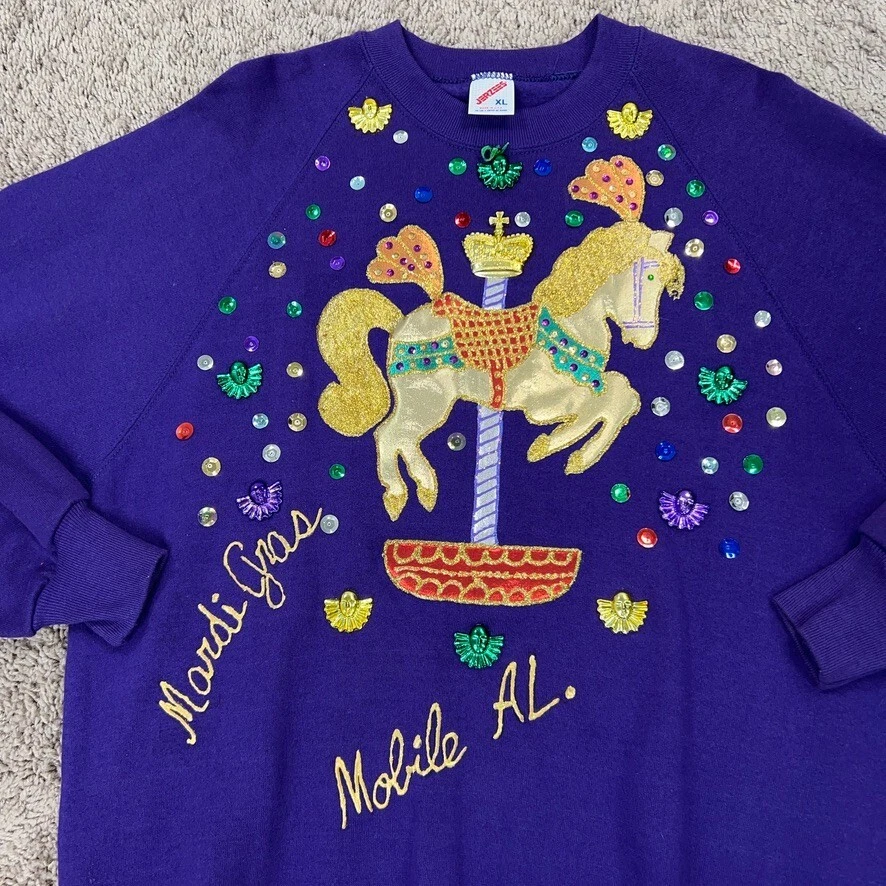 Vintage Mardi Gras Sweatshirt Womens XL Purple Bling Carousel Horse Jerzees USA
