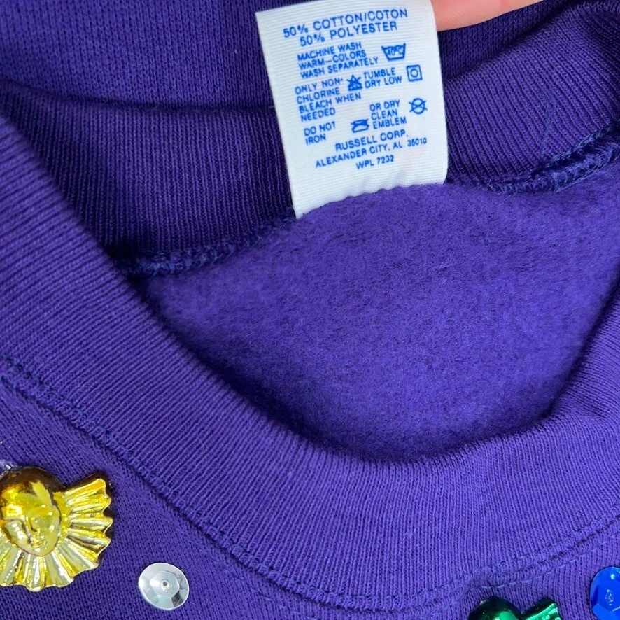 Color: Purple Brand: JERZEES Neckline: Crew Neck Fabric Type: Fleece Sleeve Length: Long Sleeve Accents: Glitter, Sequin Type: Sweatshirt Occasion: Casual Vintage: Yes Pattern: Solid Theme: 80s, 90s, Colorful, Holiday, Horse, Special Occasion, Travel & Places, Ugly Sweater Department: Women Style: Pullover Fit: Regular Country/Region of Manufacture: United States Material: Cotton, Polyester Personalize: Yes Size Type: Regular Seller Notes: “Good used condition. Please see all photos for complete description and condition details.” Closure: Pullover Size: XL