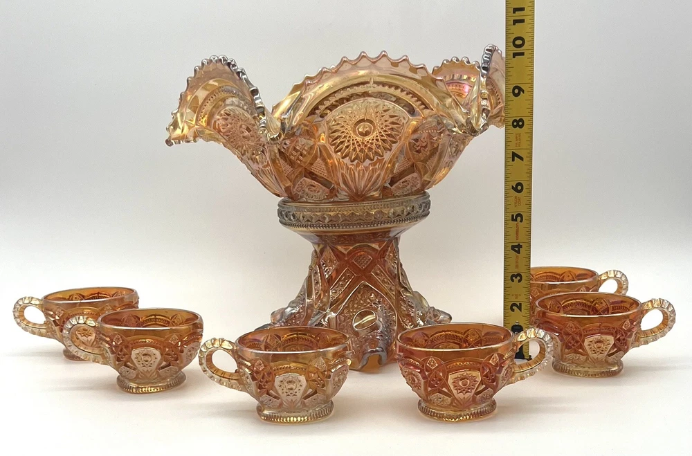 This vintage glassware set is a stunning addition to any collection. The marigold carnival design is beautifully crafted on eight pieces, including a punch bowl, six cups, and a base bowl. The set is perfect for all occasions and is sure to impress your guests. The glass material is durable and the set is designed to last for years. The round shape of the bowl and cups make them easy to hold and serve. The set is ideal for adults and is perfect for a service of six. Add this gorgeous marigold carnival glassware set to your home today. Please check all photos carefully before purchasing,photos are part of the description,what you see is what you get. 20