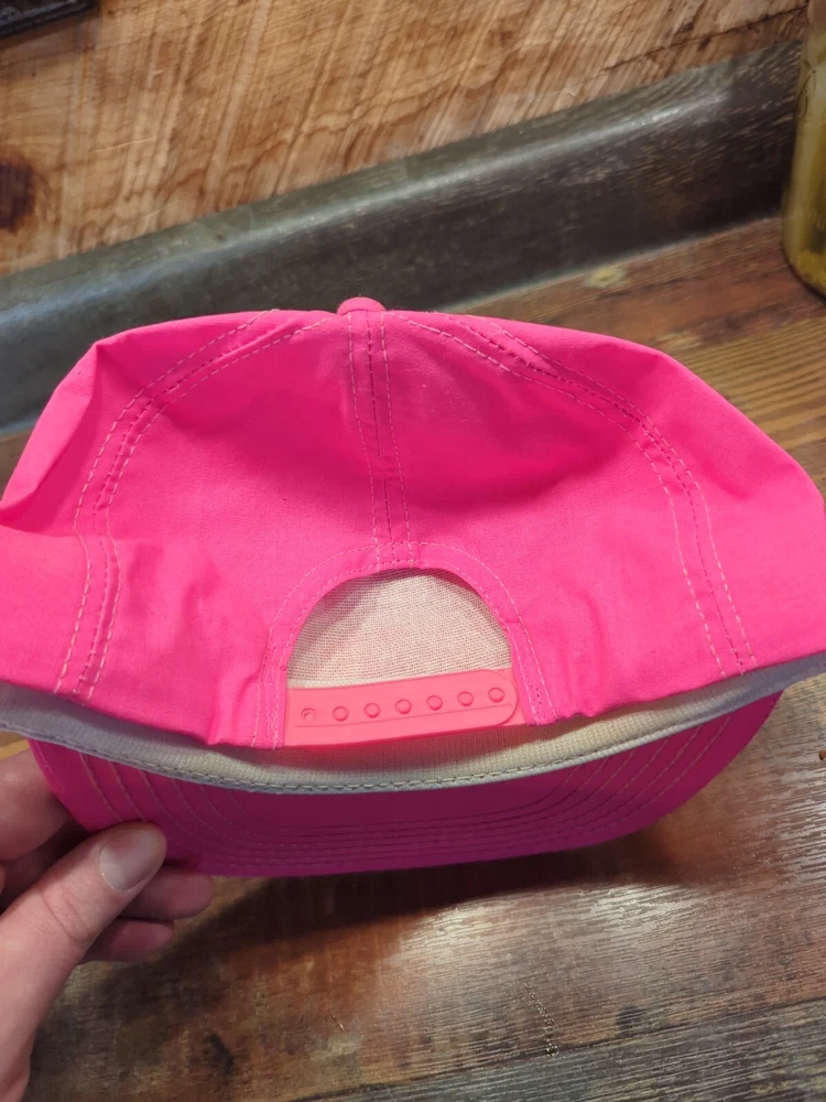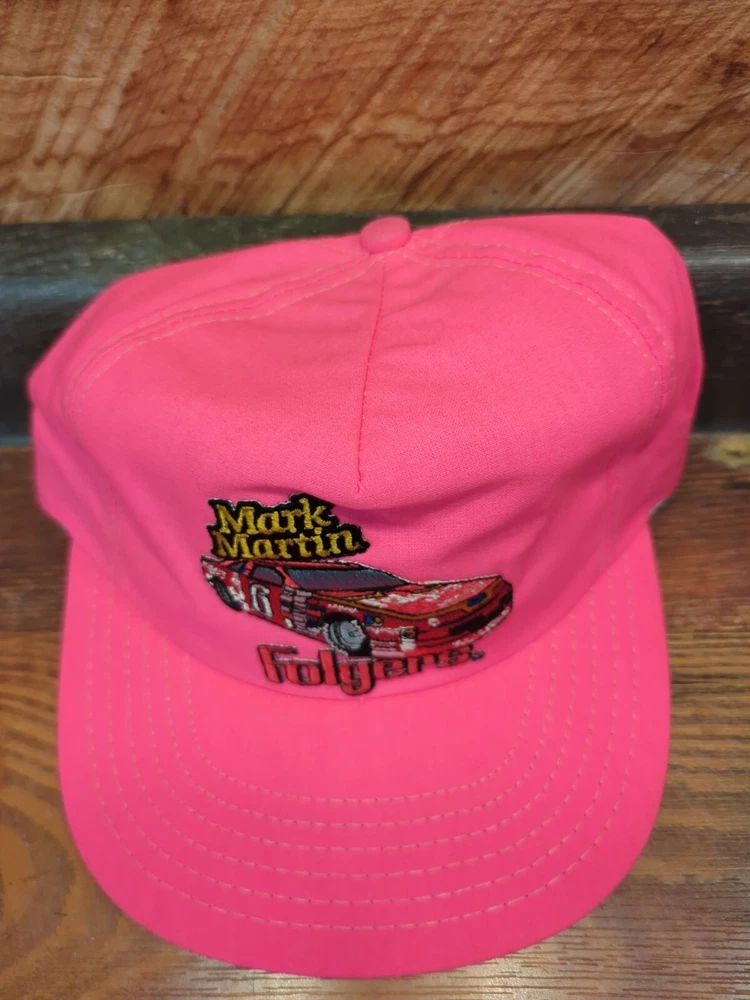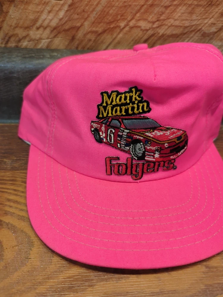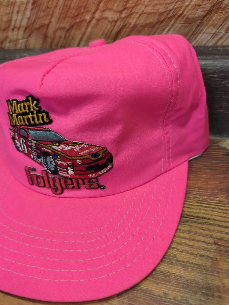 This vintage NASCAR hat features Mark Martin's #6 Folgers design in neon pink. The mesh trucker snapback cap is one size fits all and is suitable for men. Made in the United States, this item is a unique piece of fan apparel and memorabilia for NASCAR enthusiasts.