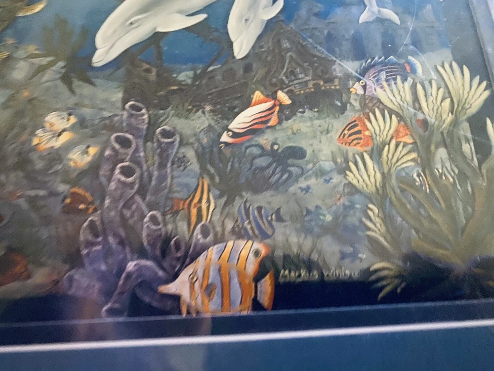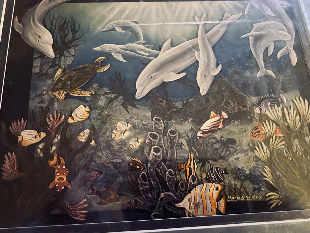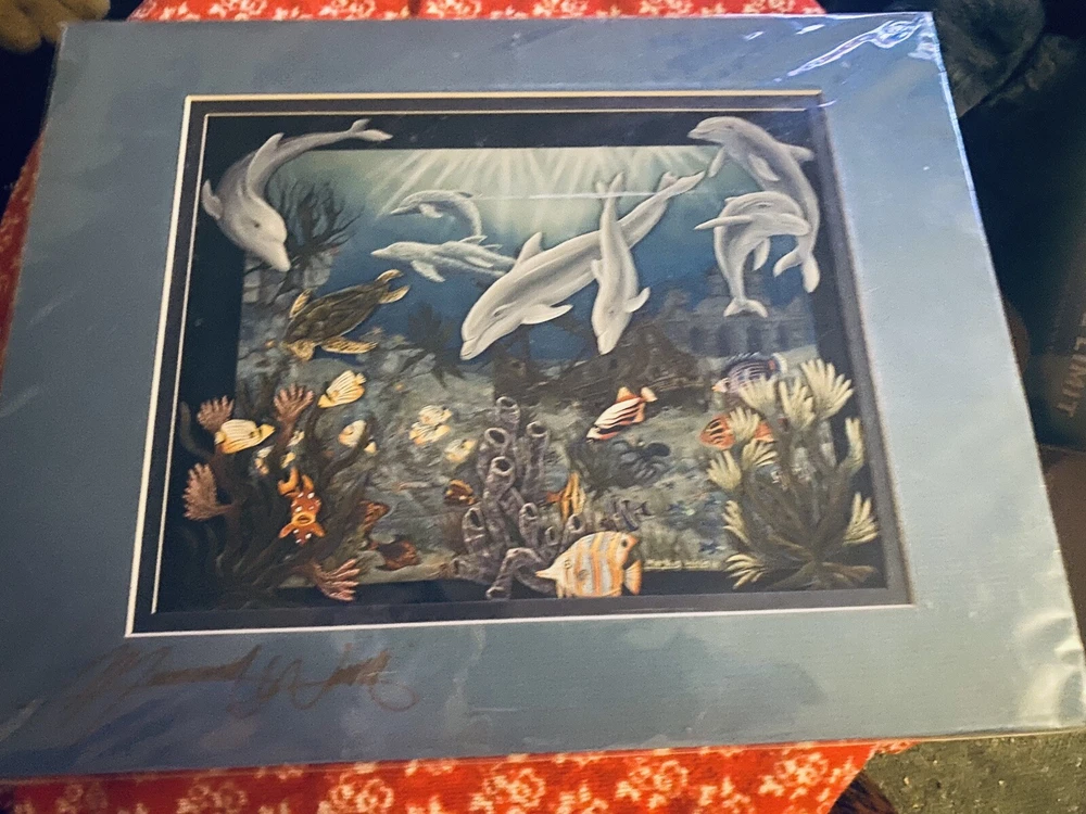 New and still sealed in cellophane sleeving. This is signed and matter. A beautiful piece. Amazing Dolphins. 14”x11”.