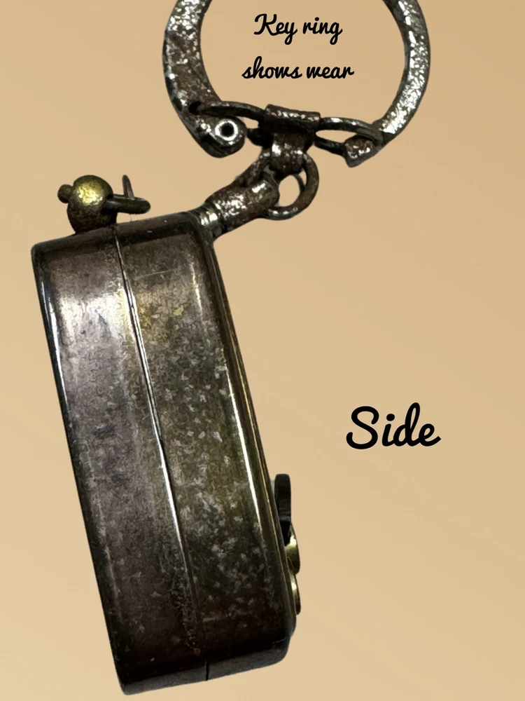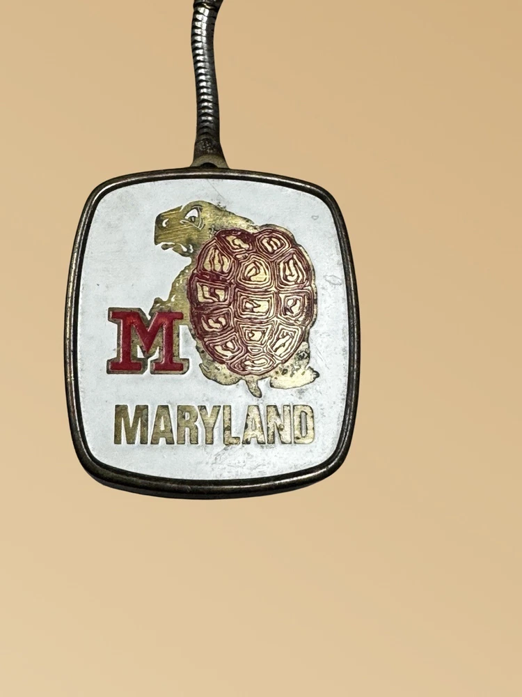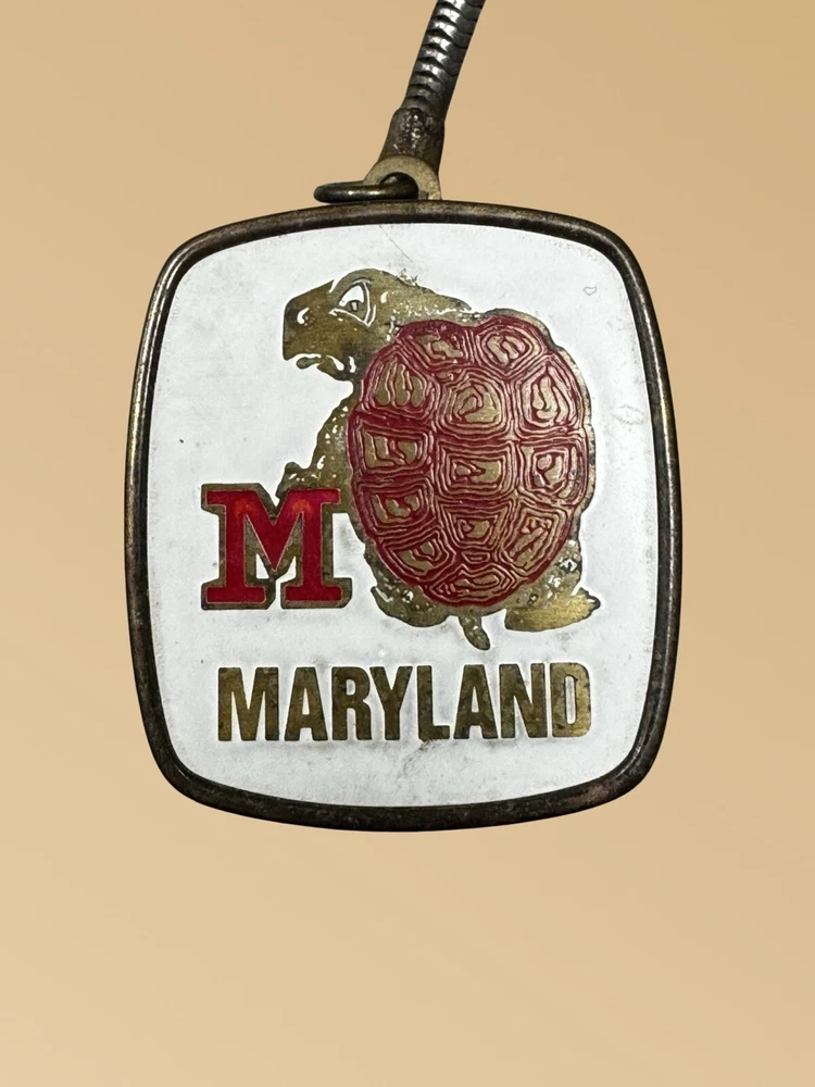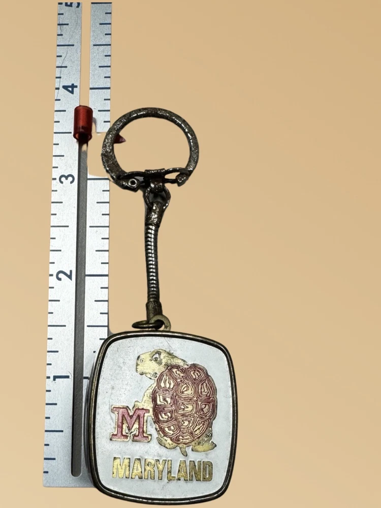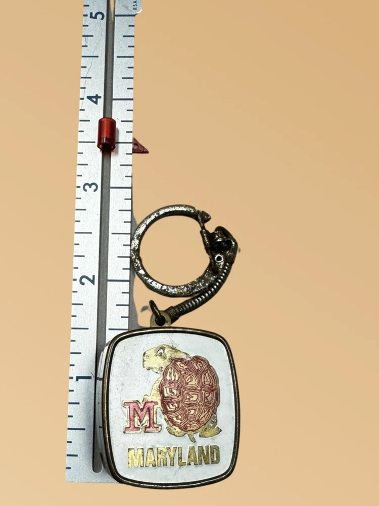 This vintage Maryland "Muscle Testudo" mascot mark musical keychain is a must-have for any sports fan. The keychain features a metal design with colorful details and a musical element that makes it stand out from the rest. Made in Japan and from the modern era, this keychain is a unique addition to any collection. Perfect for show or everyday use, this item is a great way to show off your Maryland pride. The keyring does show age. The windup music box does work Size is 1.25”x 1.25”x .50” Please see pictures for condition and feel free to contact us.