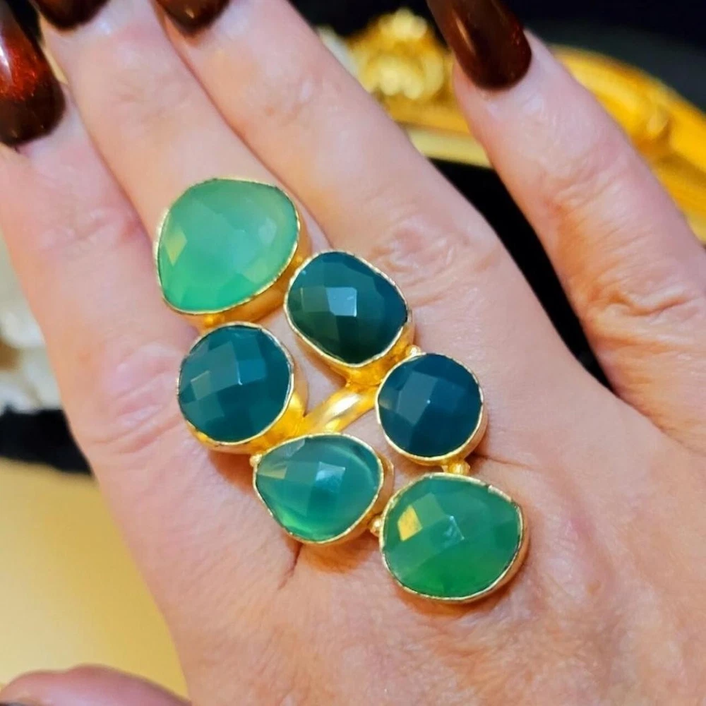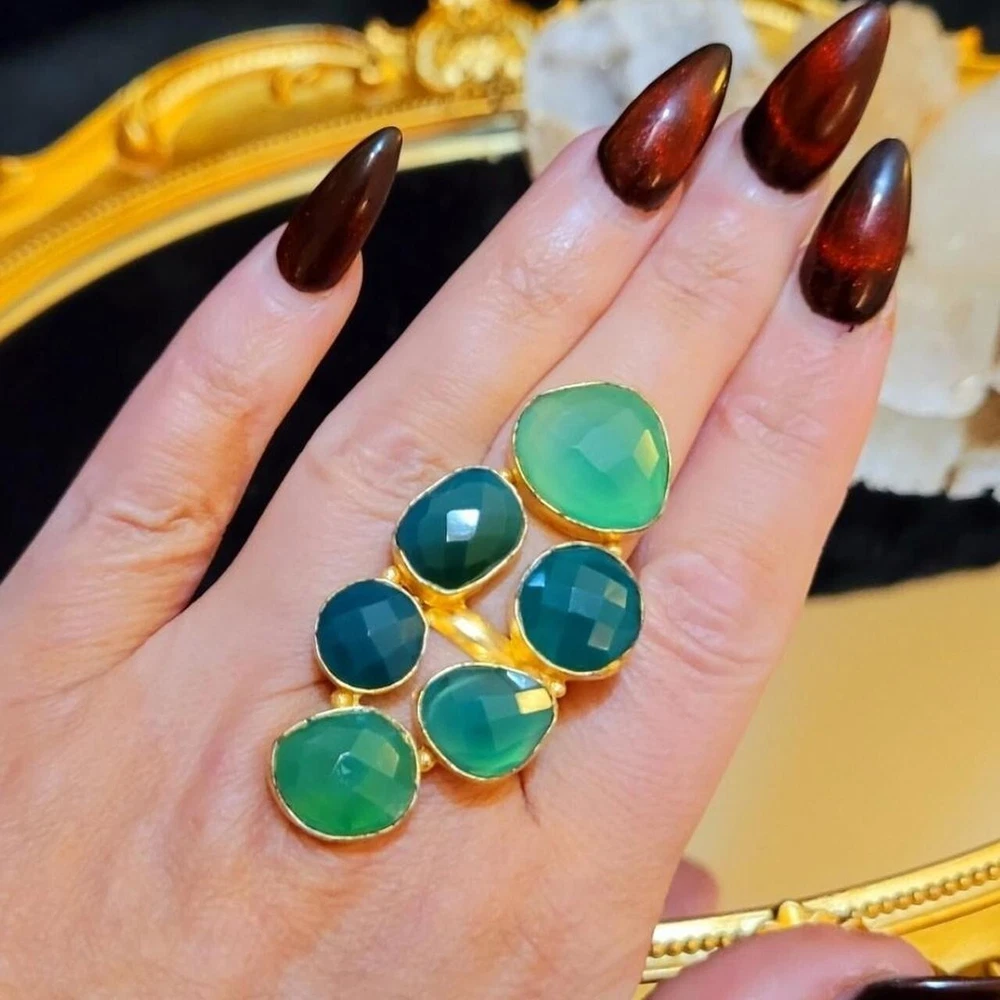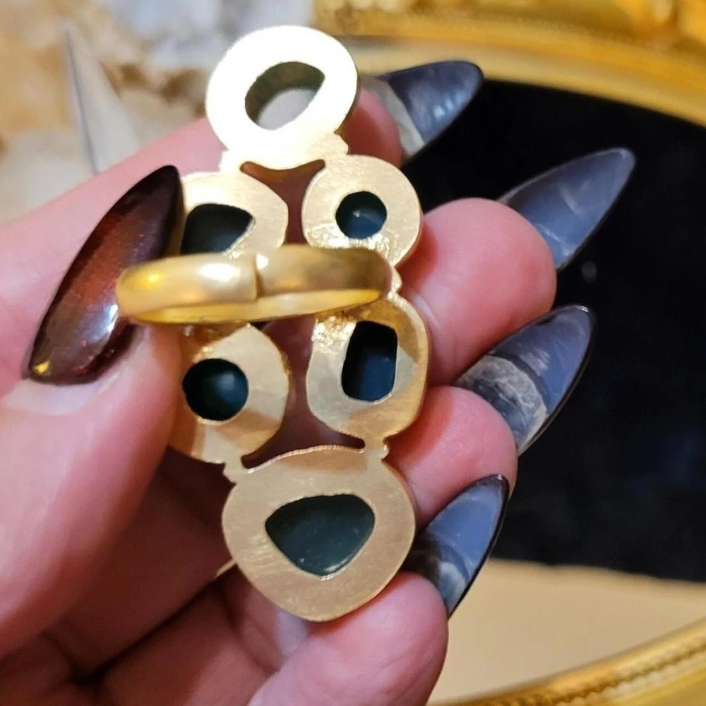 Add a touch of vintage glamour to your style with this massive, runway, unique statement ring. The asymmetrical green agate stones are set in yellow gold plating, creating a stunning contrast that is sure to turn heads. With a full finger style and a ring siRunway, which is adjustable, this handmade piece is perfect for those who love to make a statement with their jewelry. The ring also features five other agate gemstones, adding depth and texture to the overall design. Ideal for fashion-forward individuals who want to add a touch of luxury to their everyday look, this ring is a must-have for any jewelry collection. Vintage Massive Huge Rare Unique Runway Green Agate Gold Plated Statement Ring This is a gorgeous statement piece with divine green color! Stones are semi-precious green agate in varying hues. 30CT Carats of Agate 2.3" Length Gold plated Adjustable This ring is fabulous!
