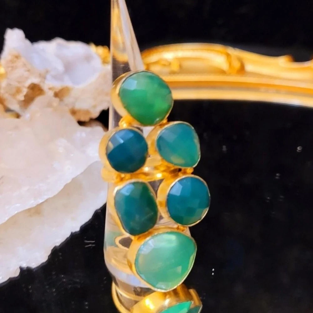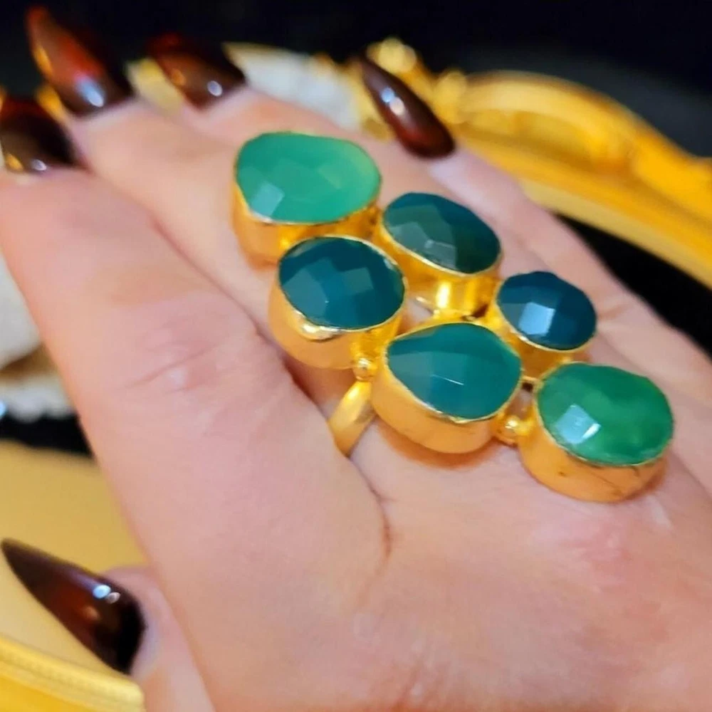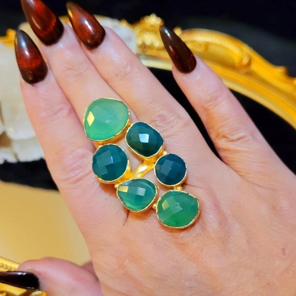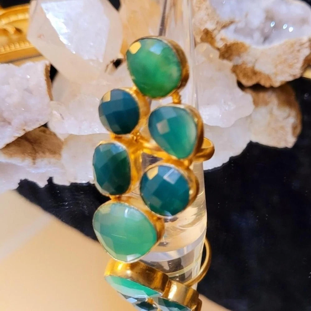 Add a touch of vintage glamour to your style with this massive, runway, unique statement ring. The asymmetrical green agate stones are set in yellow gold plating, creating a stunning contrast that is sure to turn heads. With a full finger style and a ring siRunway, which is adjustable, this handmade piece is perfect for those who love to make a statement with their jewelry. The ring also features five other agate gemstones, adding depth and texture to the overall design. Ideal for fashion-forward individuals who want to add a touch of luxury to their everyday look, this ring is a must-have for any jewelry collection. Vintage Massive Huge Rare Unique Runway Green Agate Gold Plated Statement Ring This is a gorgeous statement piece with divine green color! Stones are semi-precious green agate in varying hues. 30CT Carats of Agate 2.3" Length Gold plated Adjustable This ring is fabulous!