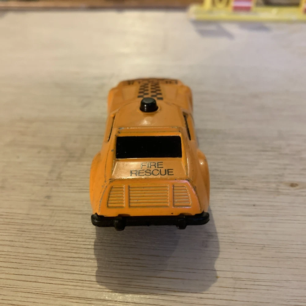 This is a vintage Matchbox 1985 Super GT Fire Rescue Car in rare orange colour. The die-cast car is part of the Ford vehicle make and is in 1:64 scale. A collectible piece from the past, this toy car is a charming addition for any Matchbox or die-cast car enthusiast.
