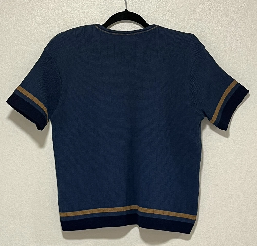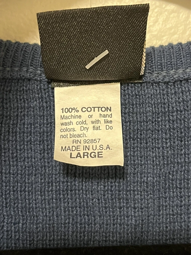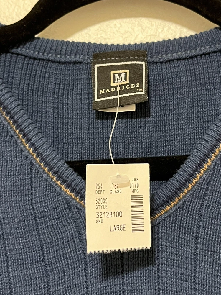 Vintage Maurice’s Cotton V-neck Sweater Large Blue Tan Classic Preppy Academia