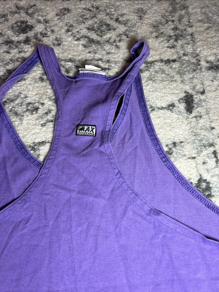 Vintage Max Muscle Gym Training Bodybuilder Faded Purple Tank Size Large Pre owned shows signs of usage throughout the years Please review all photos for measurements and details Comes from a smoke and pet free home Shipped out with care
