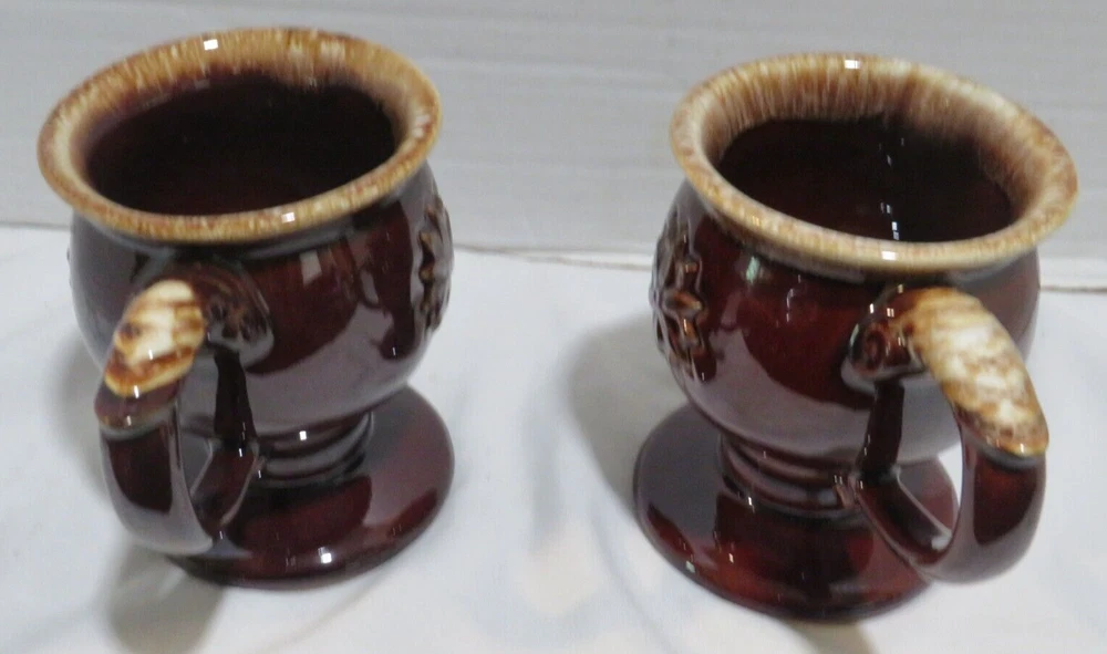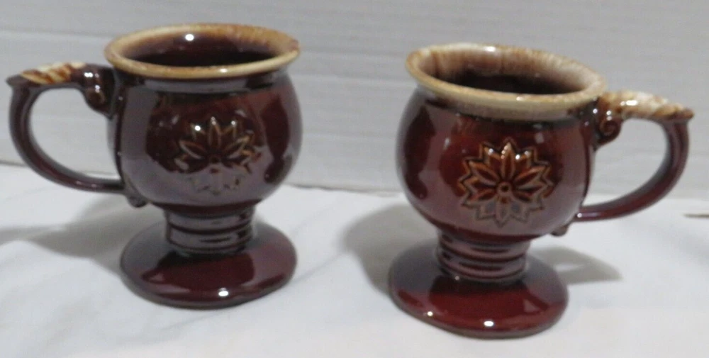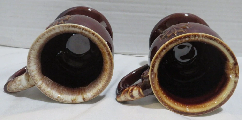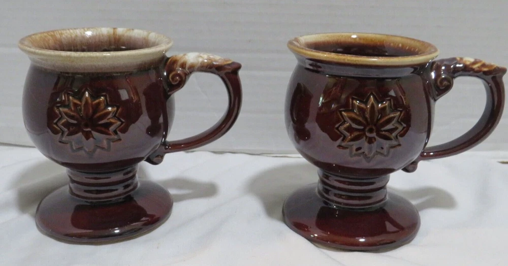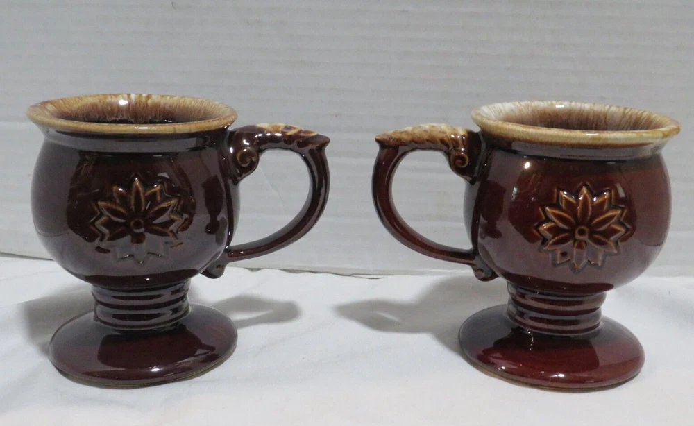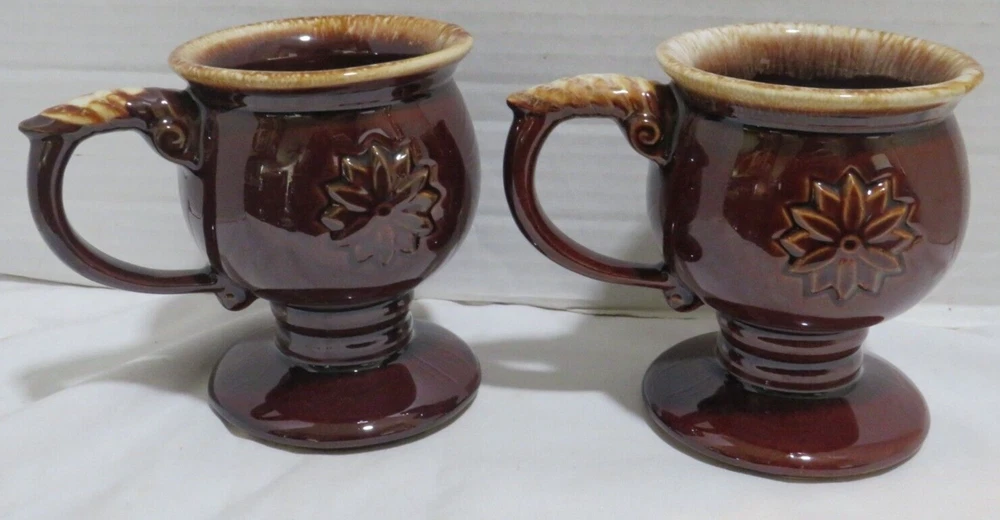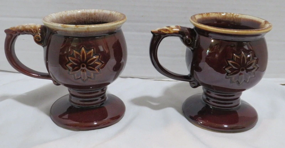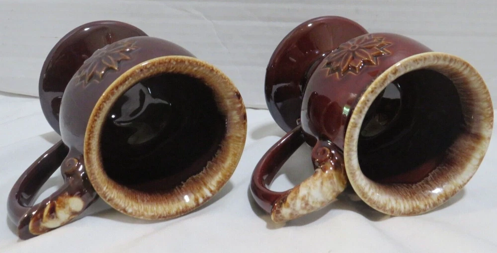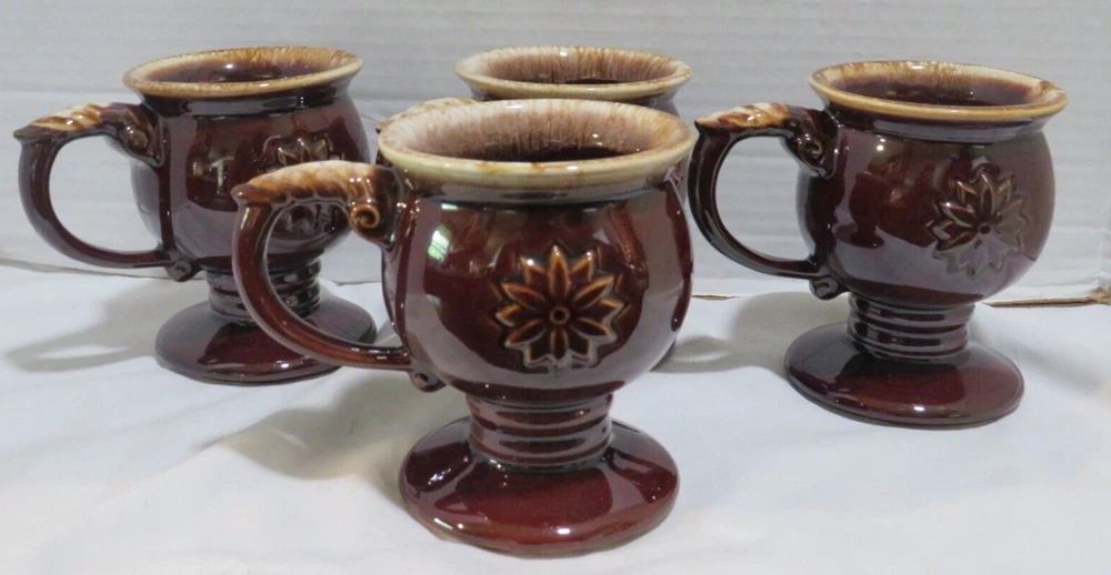 This auction is for a Lot of 4 Tiara Brown Embossed Flower pedestal Coffee Mug with Drip Glaze. These cool handled mugs have a raised flower on both sides. They are all in gently used condition with no chips, nicks, cracks or break. These hold approx. 8 ounces and measuring approx. 4 1/2" tall. Feel free to ask any questions and thanks for looking!