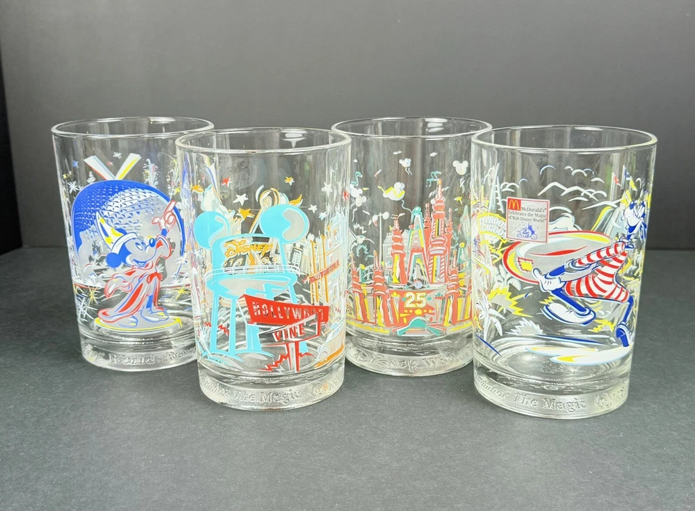 Vintage from the 1990s A really fun set of glassware for anyone that loves Disney! This glass tumbler set was a McDonald’s promotion during 1996 to celebrate Disney World’s 25th anniversary. This is a complete set of 4, never used. New! with no chips or cracks. They are heavy glass 16 oz. tumblers. Each glass has beautiful, pristine full-color Disney graphics – a different scene on each glass tumbler. Around the base rim of each glass is embossing reading: "Remember the Magic of Walt Disney World”. The bottom center is embossed with a “25” in the center of a pumpkin carriage outline set in front of the Disney Castle outline. A Very Nicely done set of Disney commemorative glassware! The embossing is detailed and beautiful, as are the colorful graphics on each glass. A 'must have' for the collector of all things Disney!! Approximate Measurements: 5" tall 3-1/4" diameter 16 oz. Blessings!!