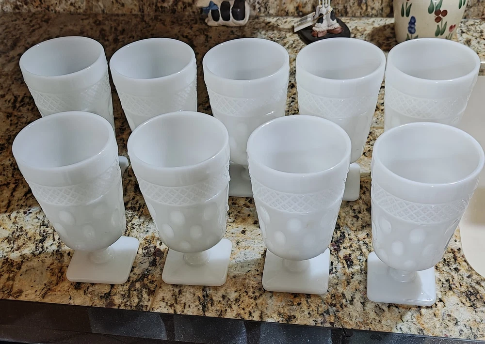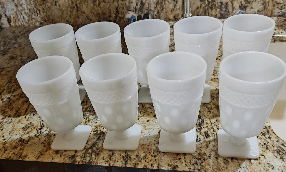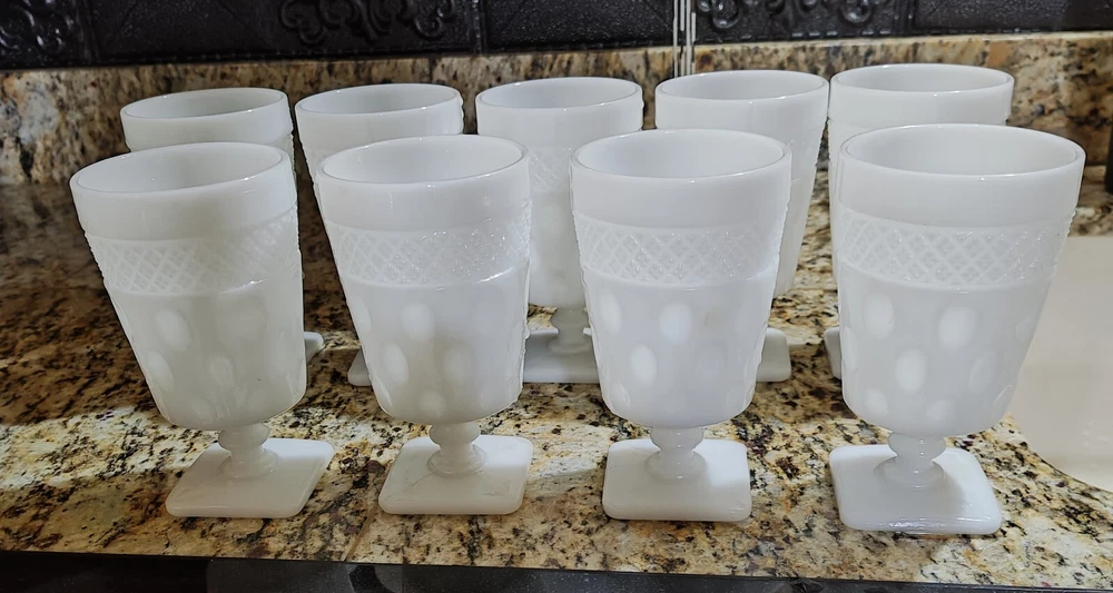 Vintage McKee opal milk glass goblets featuring a set of 9 goblets measuring 5.5 inches in height. Made from elegant milk glass, these goblets are perfect for all occasions. The white color and production style add a classic touch to your drinkware collection.