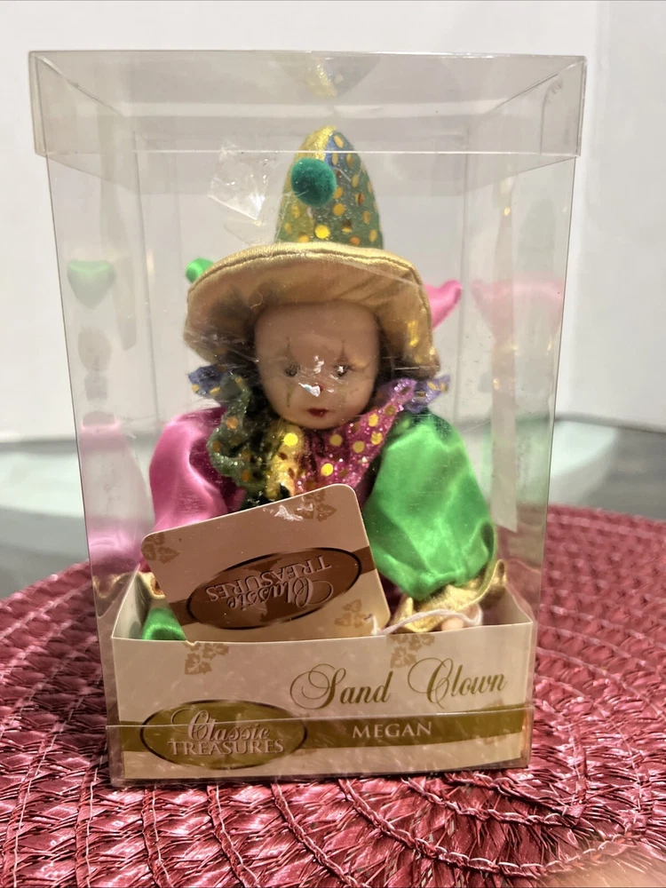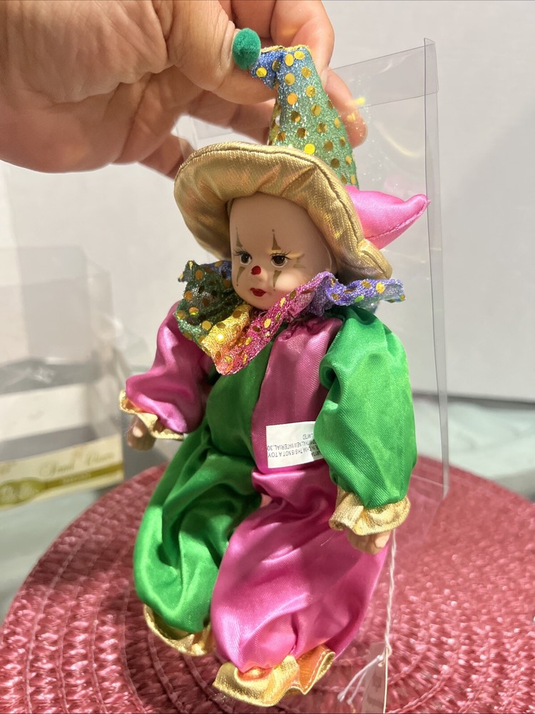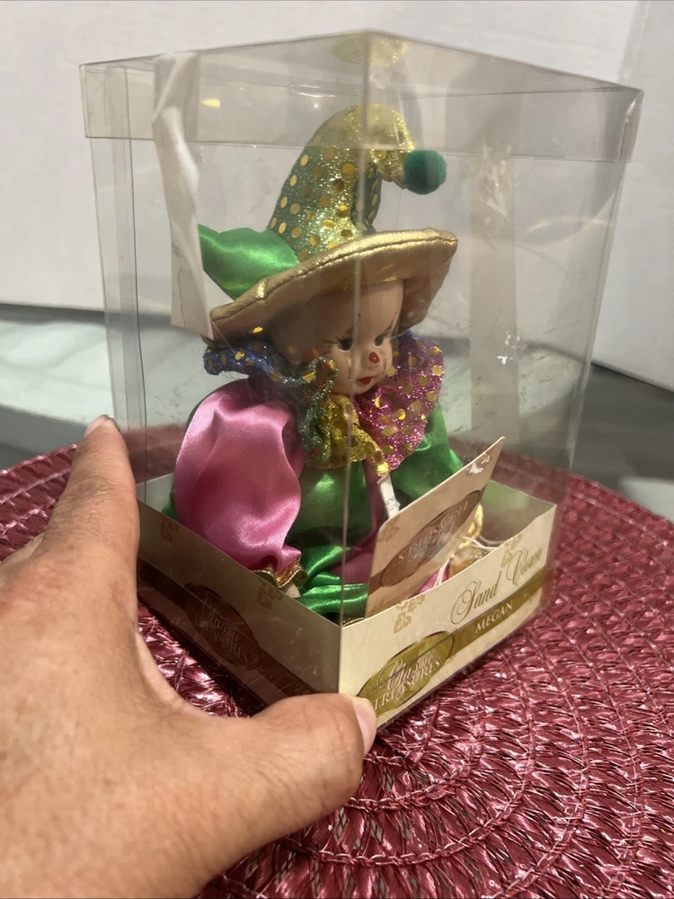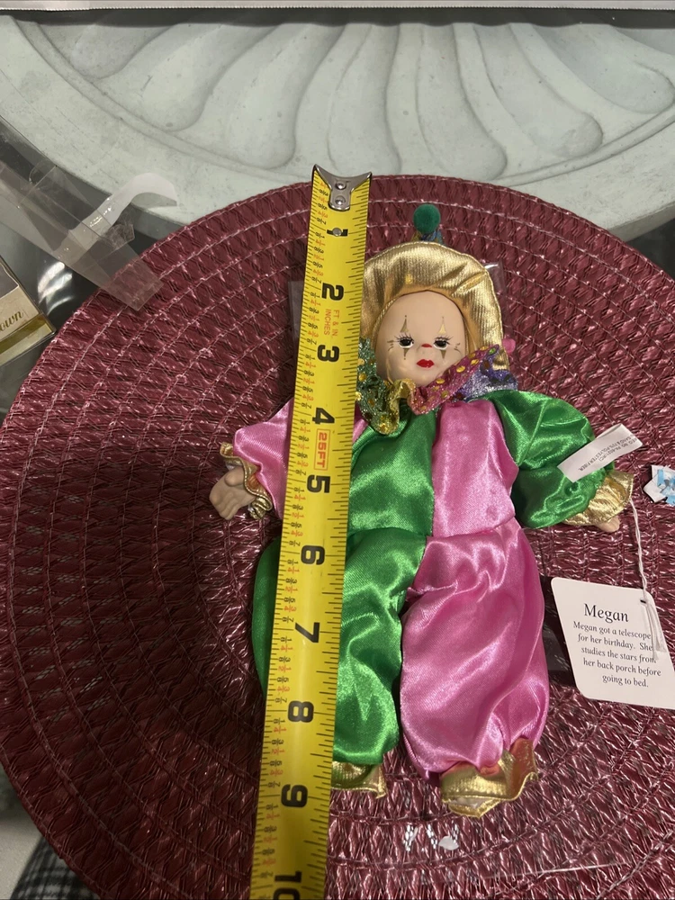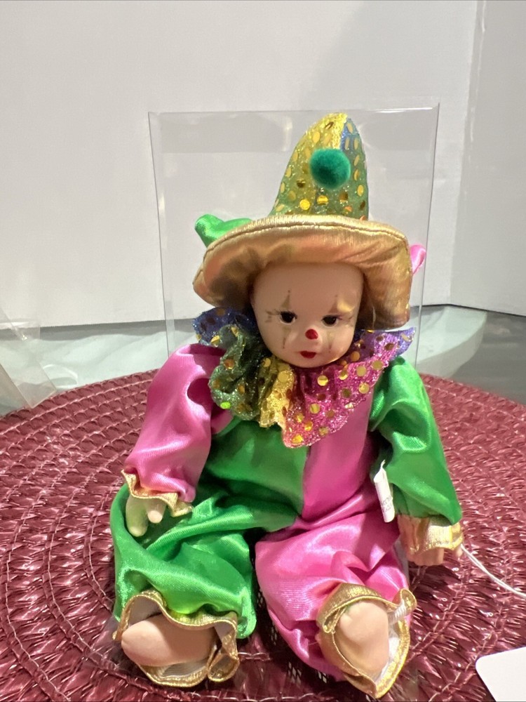 This vintage Megan Classic Treasures porcelain clown doll exudes happiness and love with its curly red hair and light complexion. Standing at 16 inches tall, this original 1989 doll from China comes with a stand for display. A unique addition to any doll collection, this clown doll is a charming representation of joy and nostalgia, perfect for collectors who appreciate vintage porcelain dolls with a touch of whimsy. Look at the pictures and ask questions before making your purchase