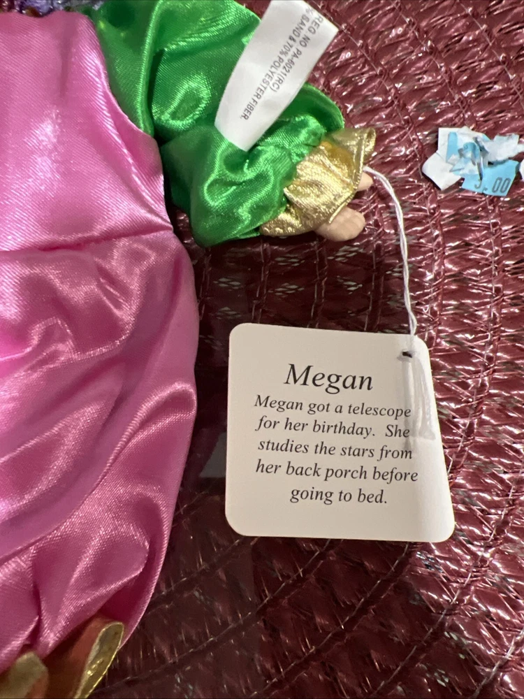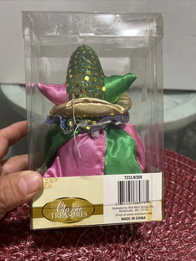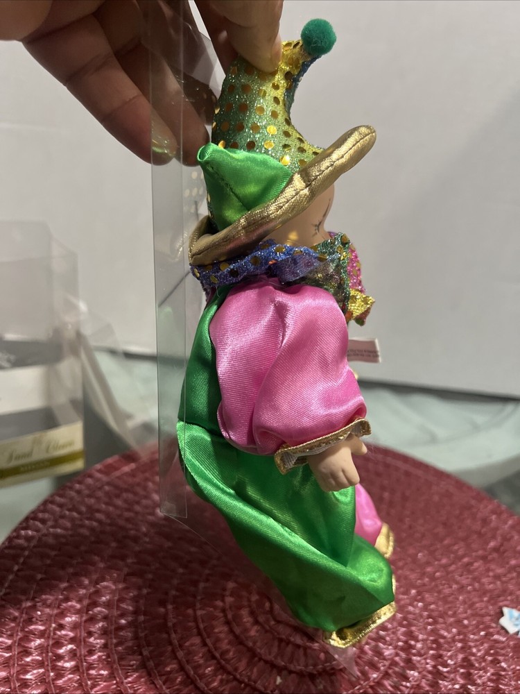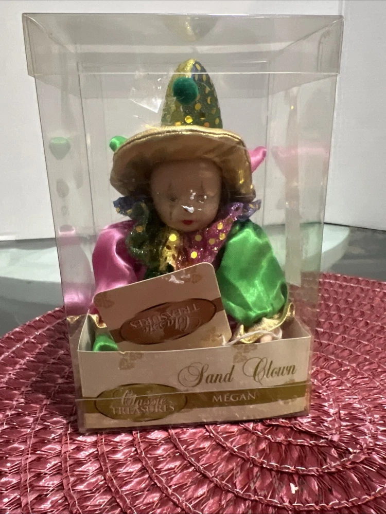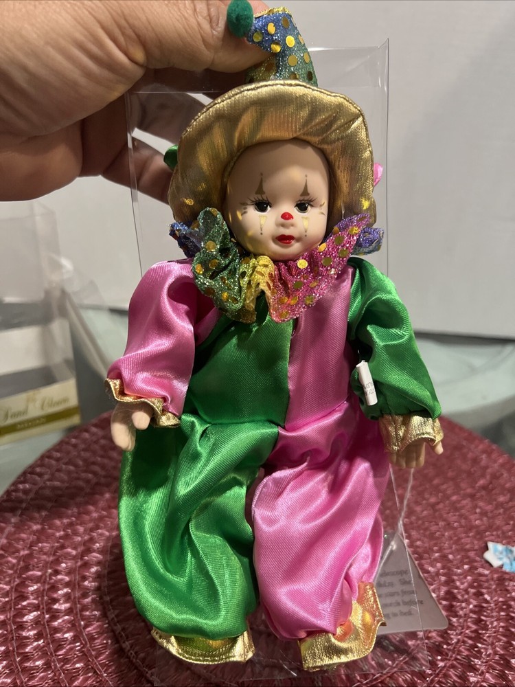 This vintage Megan Classic Treasures porcelain clown doll exudes happiness and love with its curly red hair and light complexion. Standing at 16 inches tall, this original 1989 doll from China comes with a stand for display. A unique addition to any doll collection, this clown doll is a charming representation of joy and nostalgia, perfect for collectors who appreciate vintage porcelain dolls with a touch of whimsy. Look at the pictures and ask questions before making your purchase