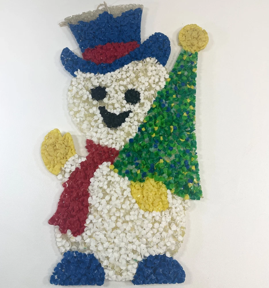 Vintage Melted Plastic Popcorn Snowman with Christmas Tree Wall Hanging 18"