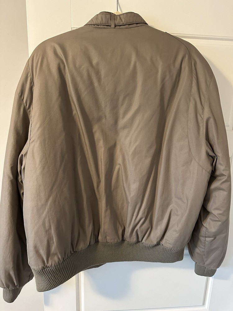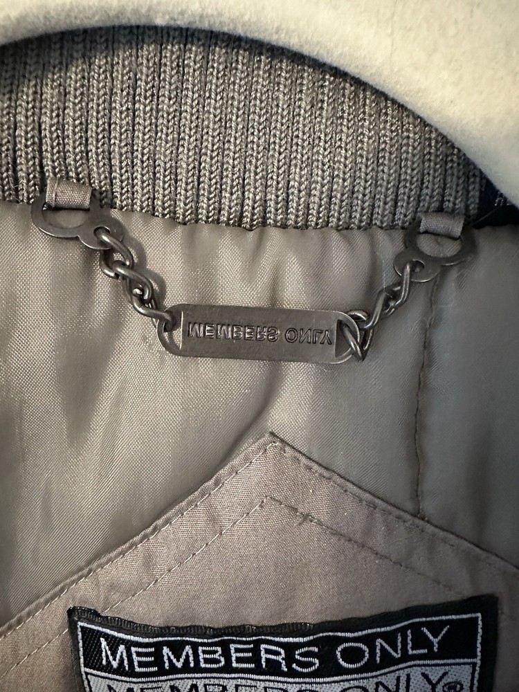 This vintage Members Only bomber jacket is a must-have for any 80s fashion enthusiast. With a beige, tan, and light brown color scheme, this jacket features a solid pattern and a softshell fabric type. The outer shell is made of polyester, and the lining is also made of polyester and cotton. The jacket has a full zip closure, with a band collar style, and is accented with a strap, zipper, and logo. It is lightweight and has pockets, making it perfect for fall and winter seasons. This jacket is a size 46 and is made in Hong Kong. Add this vintage gem to your wardrobe today!