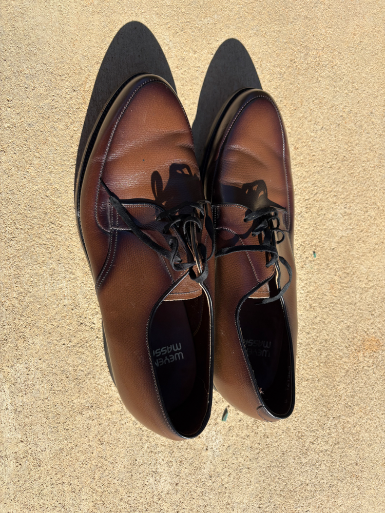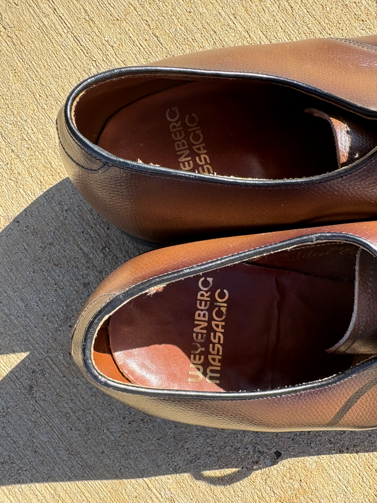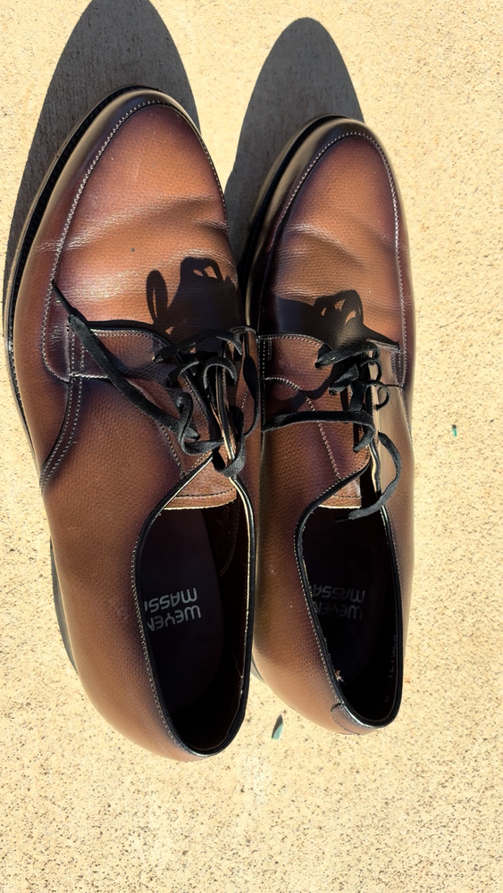 I am listing these shoes as pre worn but they are in excellent condition. Worn once and they are an instant conversion starter because of real vintage look. These will be difficult to find another pair on EBay or other sites similar to these. The product is a pair of vintage men's dress shoes by Weyenburg Massagenic, dating back to the late 60s. These classic brown leather shoes in size 10 feature a wingtip design, perfect for adding a touch of retro style to any outfit. A timeless piece for any man looking to make a statement with their footwear, these shoes offer a combination of quality craftsmanship and 60s-inspired charm.