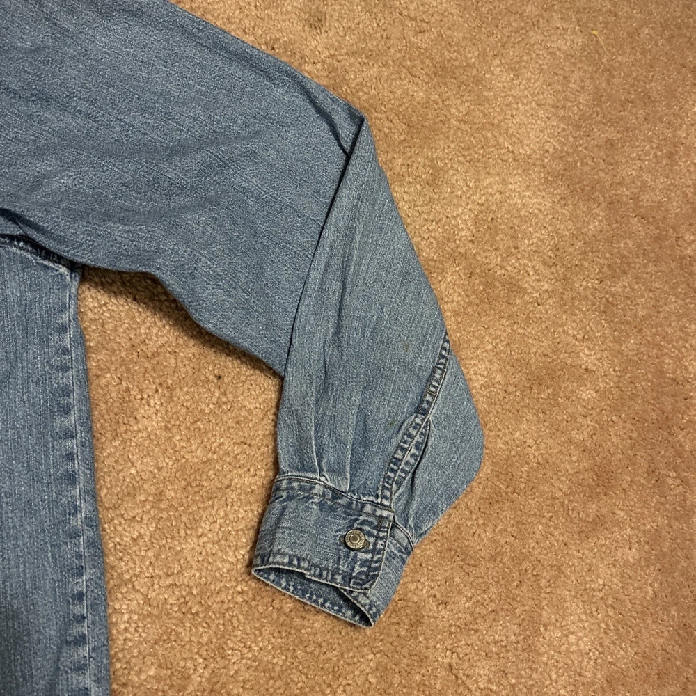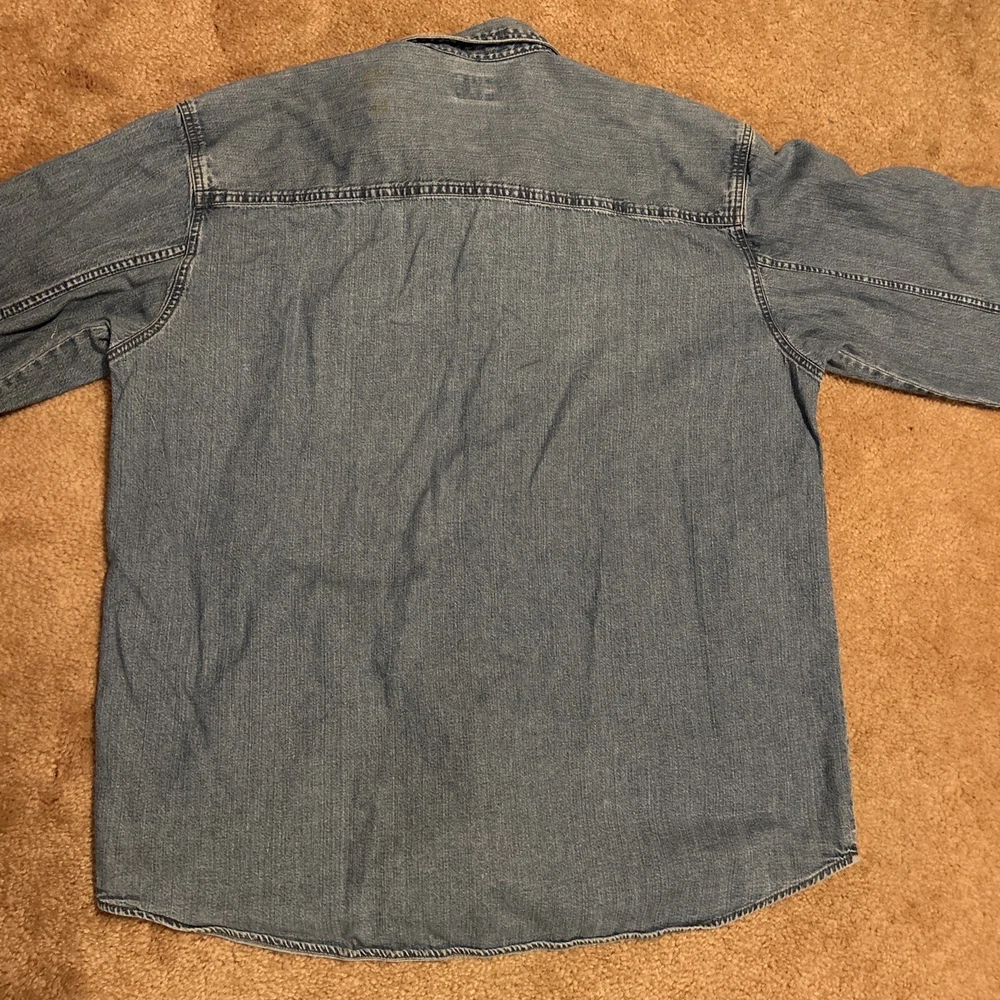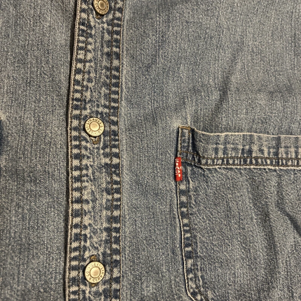 This vintage Levi's denim button-up shirt is a must-have for any casual wardrobe. The long sleeves and metal buttons give it a rugged look that pairs perfectly with jeans or khakis. The denim fabric is durable and has a unique texture that adds to the overall appeal of the shirt. It's sized as a men's large, and the regular fit makes it comfortable to wear all day. The blue color and metal theme give it a classic, timeless look that will never go out of style. Add this Levi's shirt to your collection today!