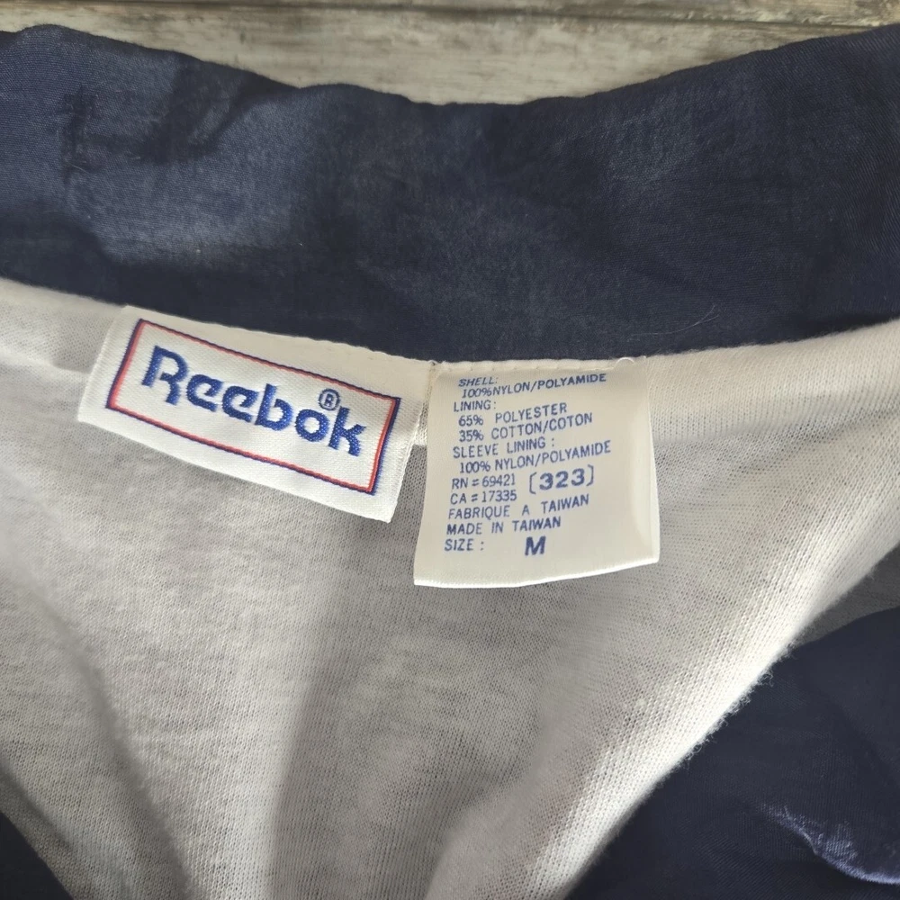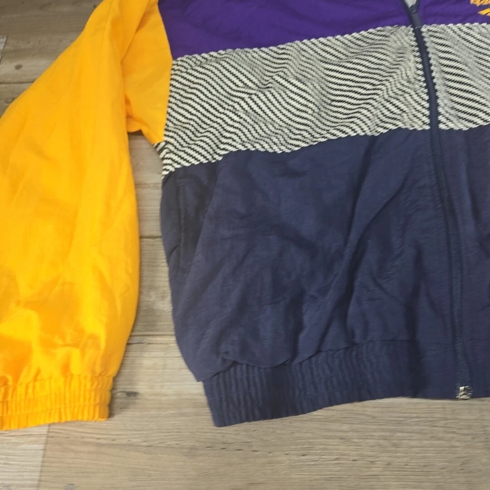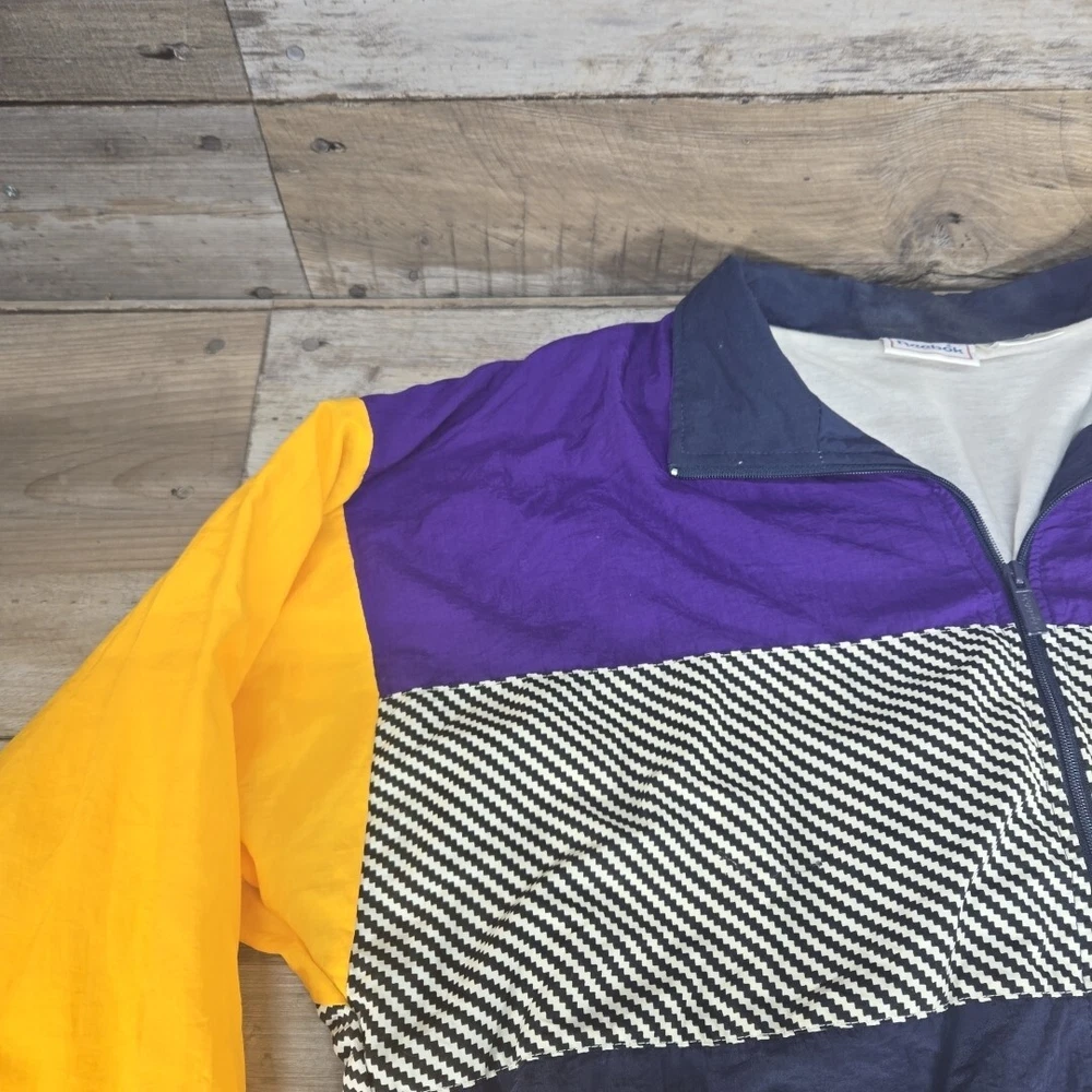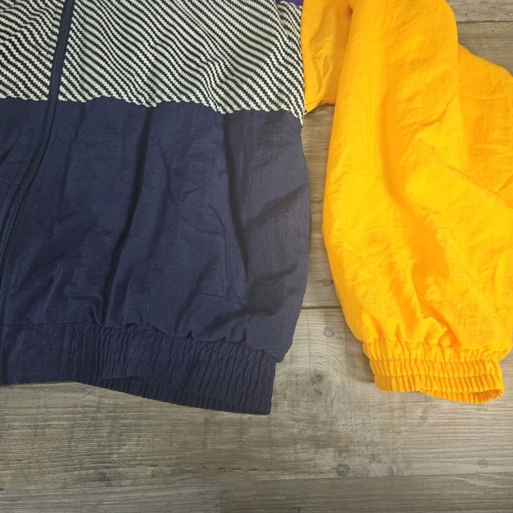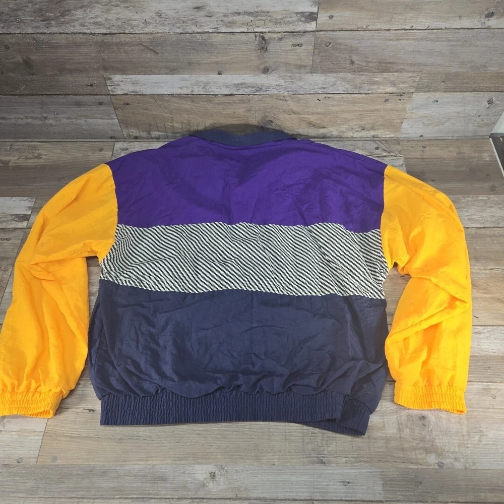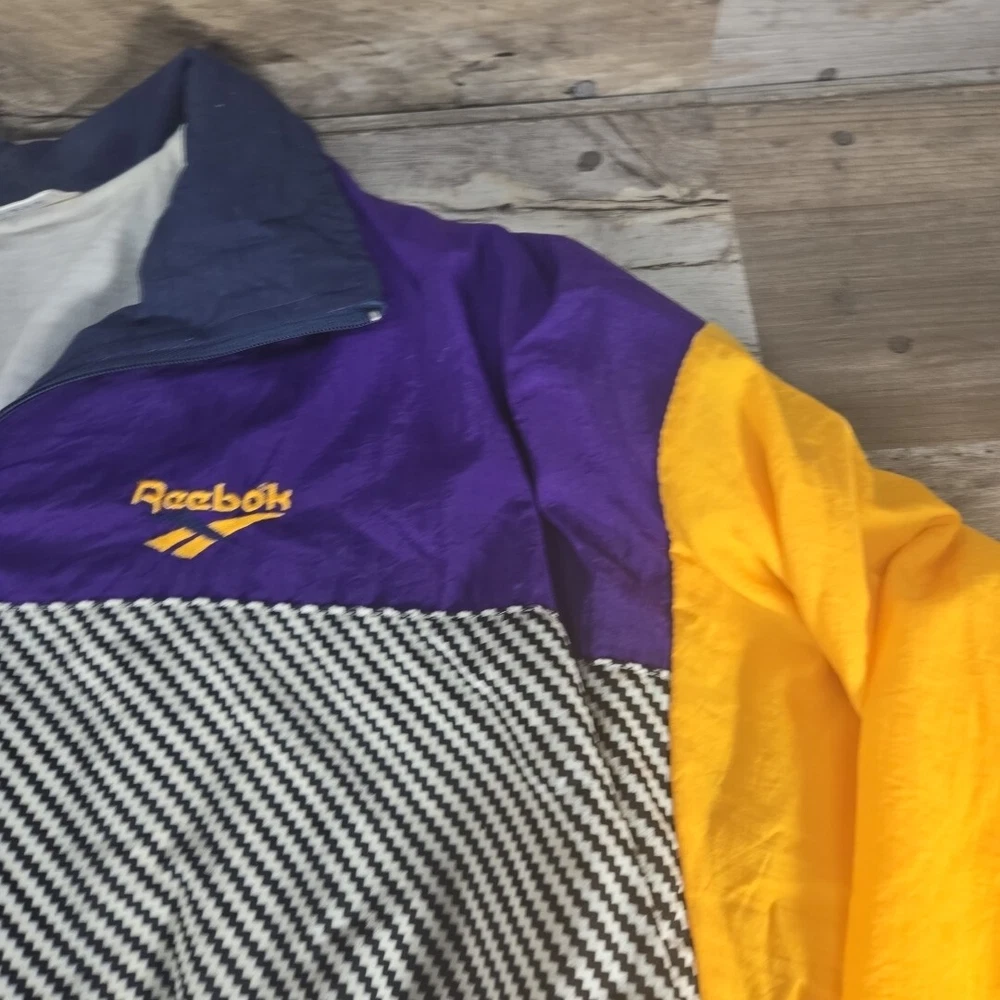 This vintage Reebok windbreaker jacket for men features a unique purple, yellow, and blue striped pattern, perfect for adding a pop of color to any outfit. The jacket is made of durable nylon material and is designed in a comfortable, regular fit size for men. With its classic windbreaker style, this jacket is ideal for outdoor activities and casual wear. The jacket is pre-owned but in great condition, with no noticeable flaws or defects. Add this stylish and functional jacket to your collection today.
