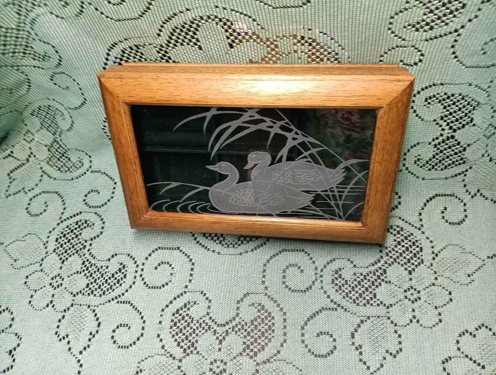 Vintage Men's Wooden Jewelry Storage Box Etched Glass Top Lid Ducks on Pond