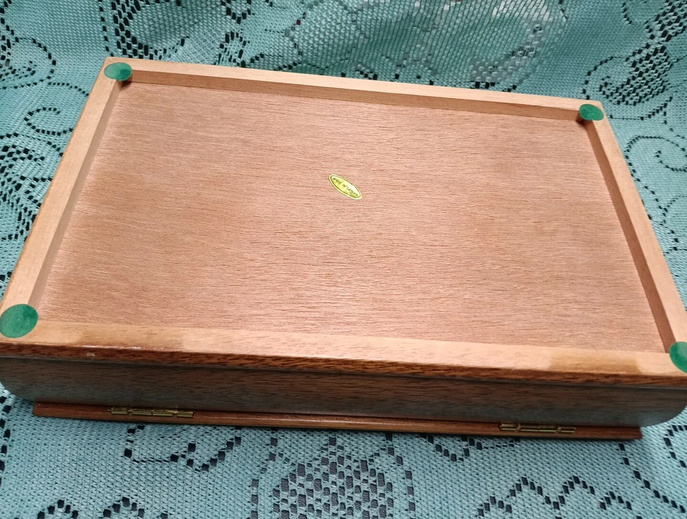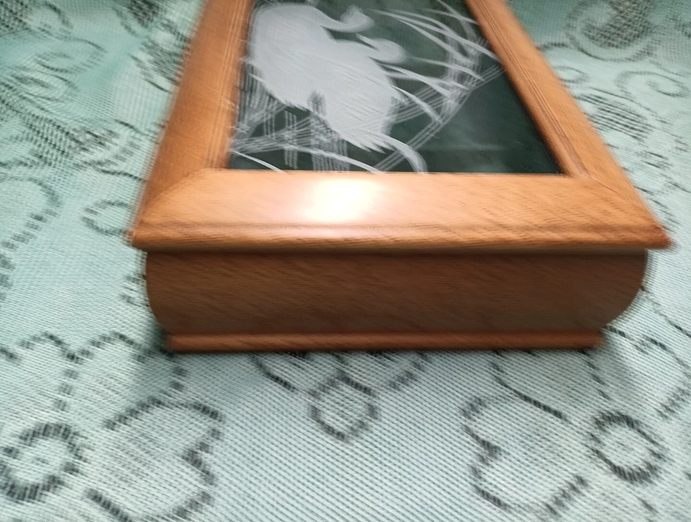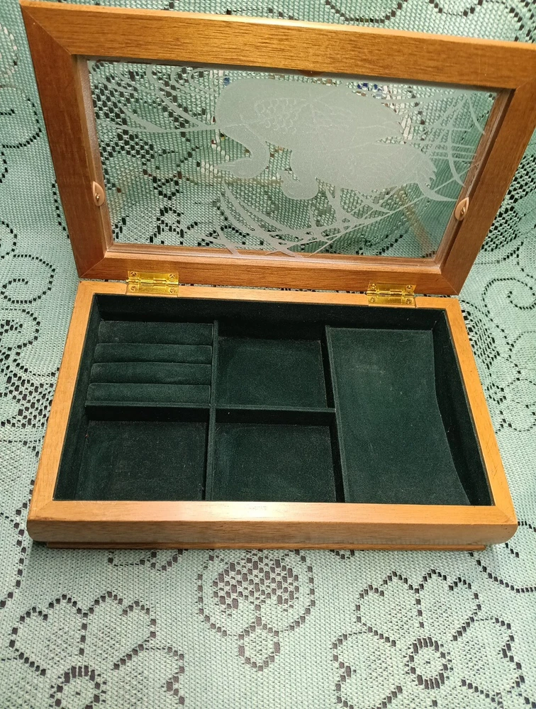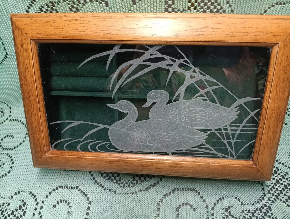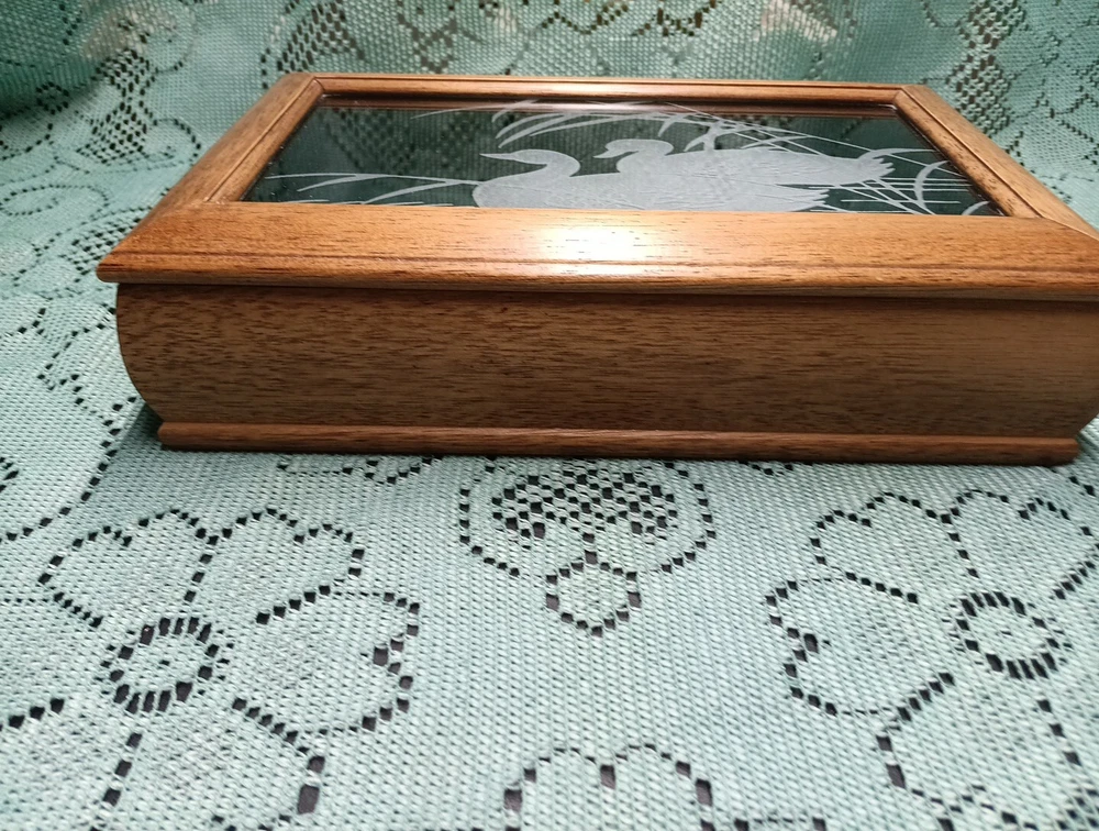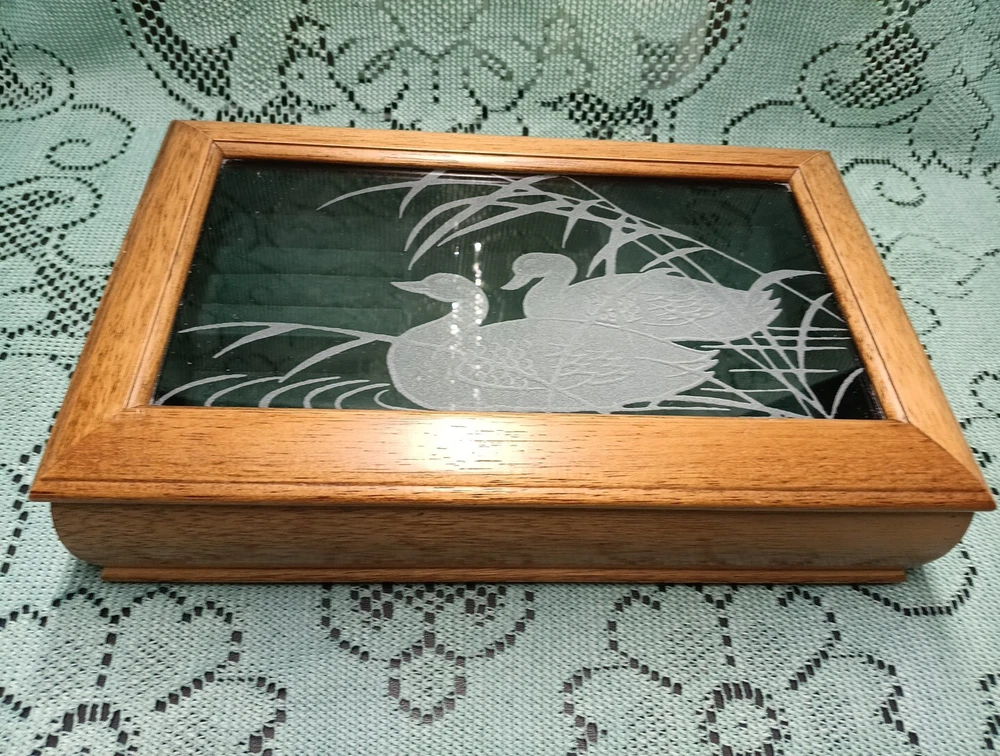 HomeVintage Men's Wooden Jewelry Storage Box Etched Glass Top Lid Ducks on Pond