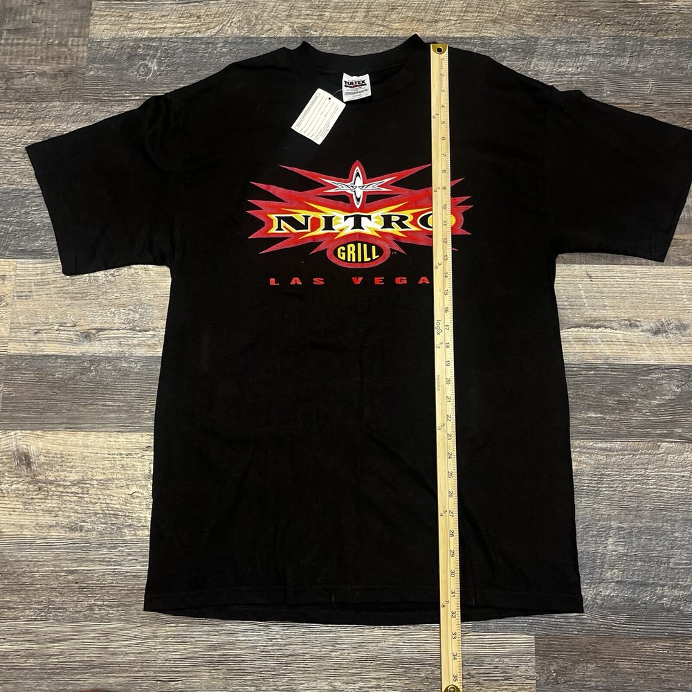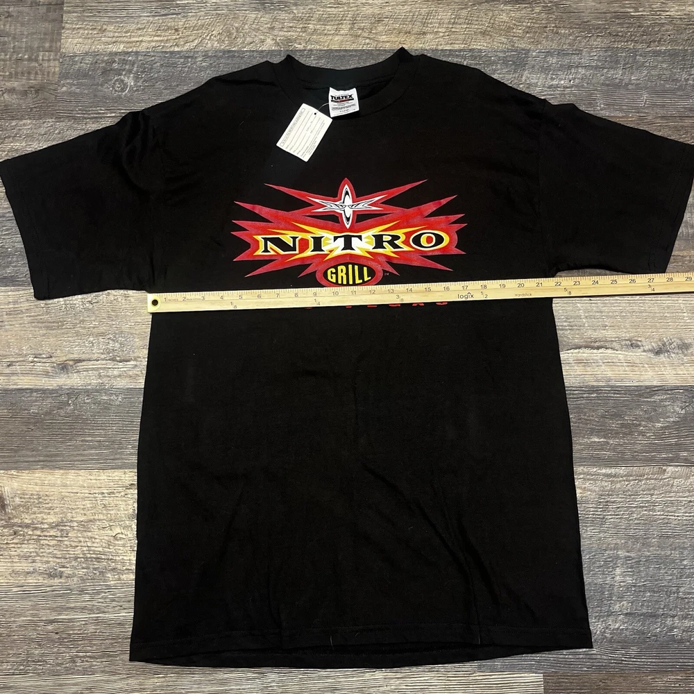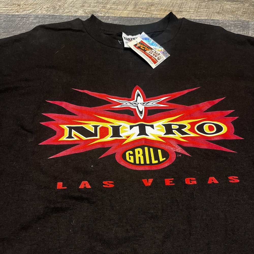 This vintage men's XL WCW/NWO Nitro Grill T-shirt features a graphic print with a wrestling theme, specifically from the 90s era. The shirt has a crew neck and short sleeves, made of black cotton knit material. It is a limited edition with a retro look and is machine washable. The design is inspired by the WCW wrestling character family, perfect for fans of the sport.