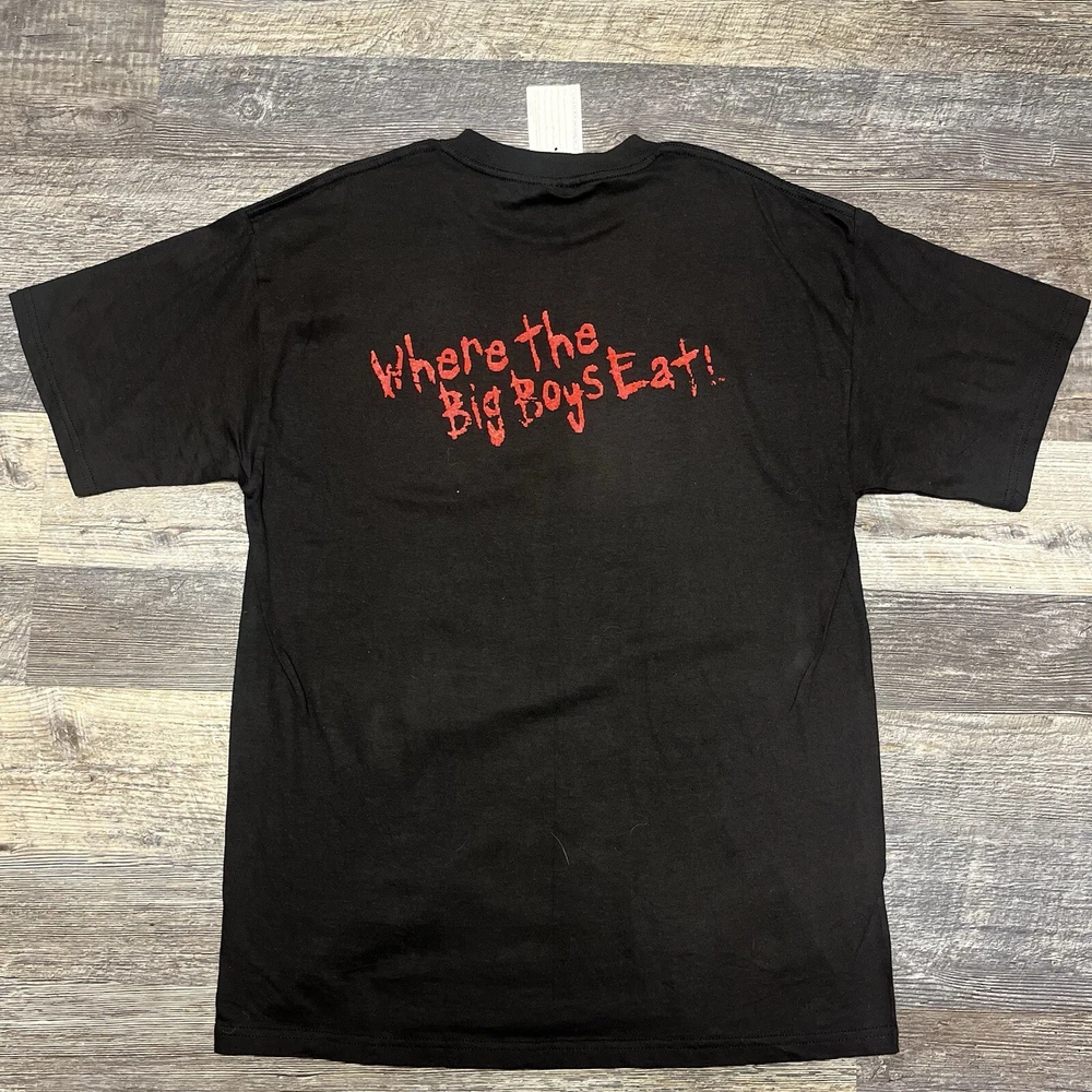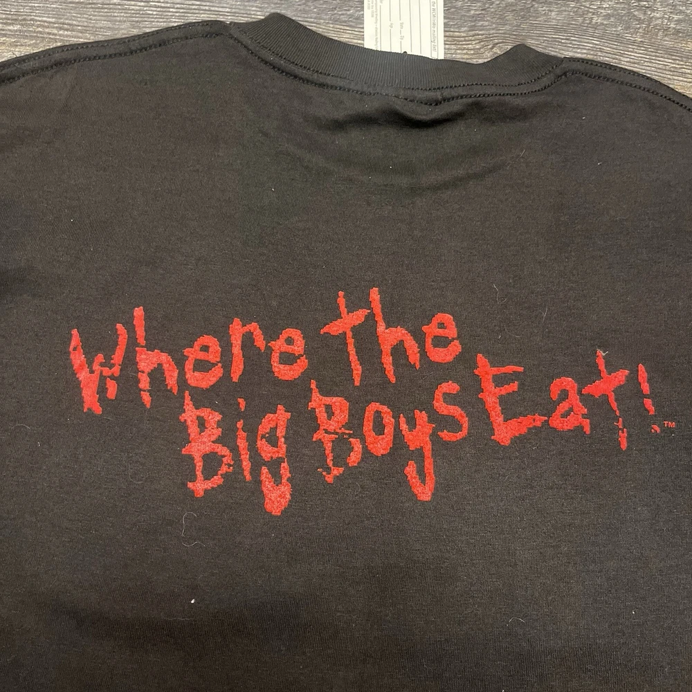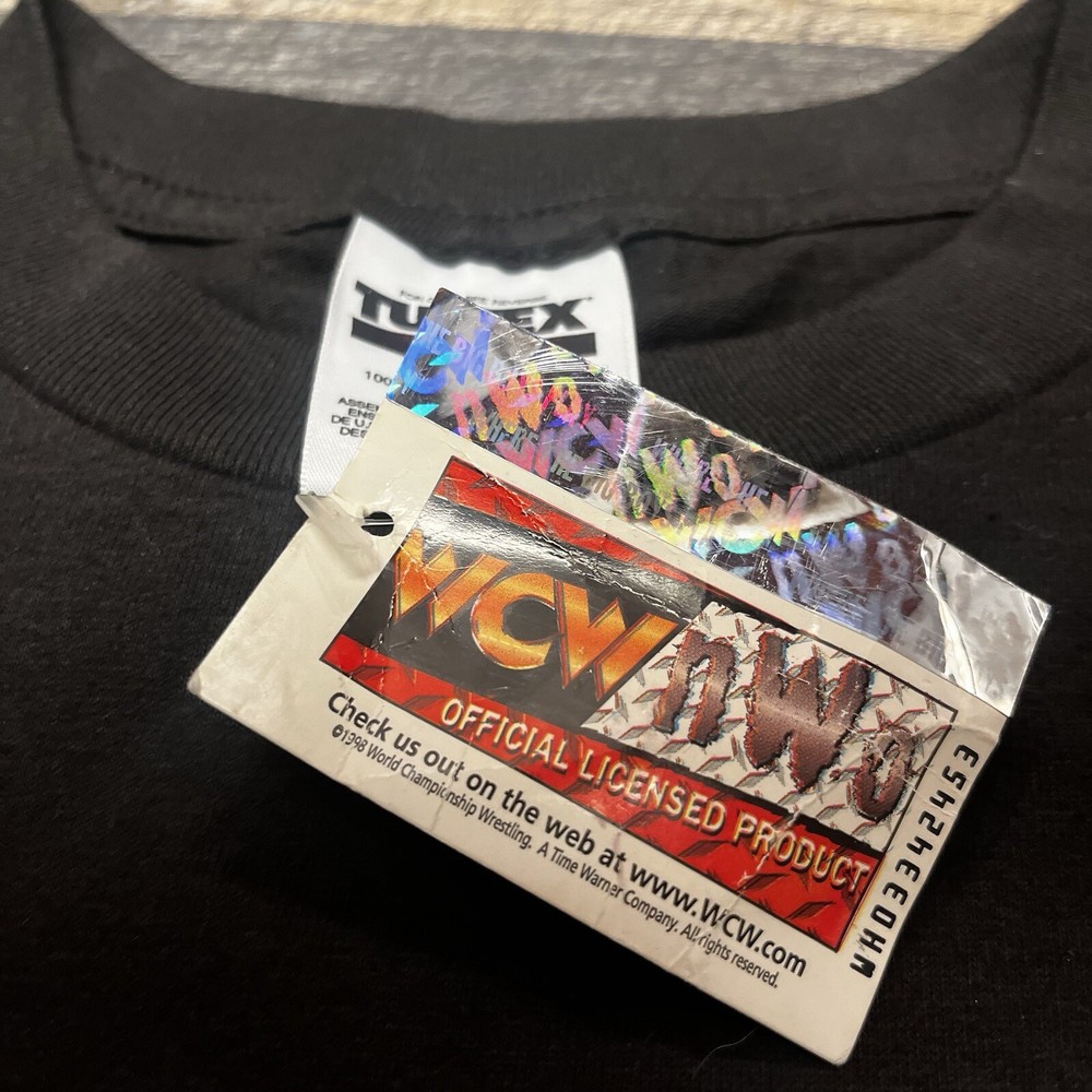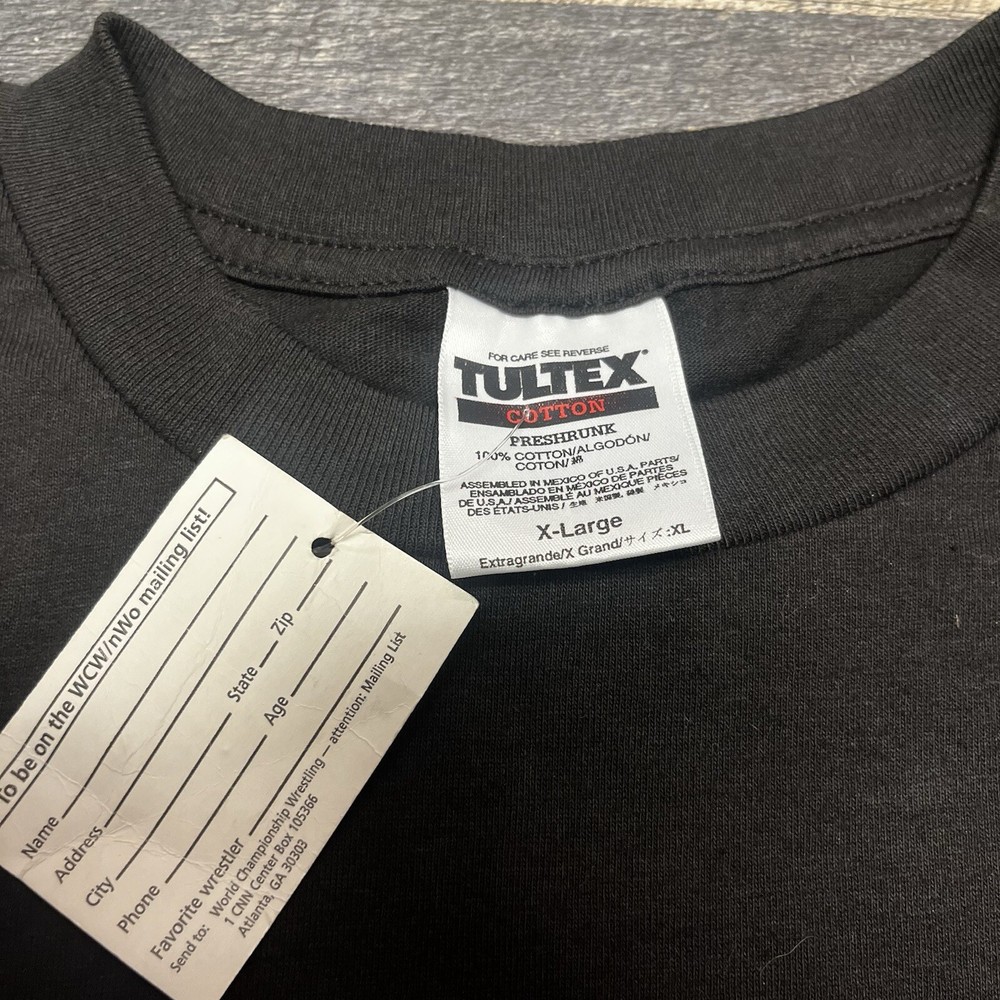 This vintage men's XL WCW/NWO Nitro Grill T-shirt features a graphic print with a wrestling theme, specifically from the 90s era. The shirt has a crew neck and short sleeves, made of black cotton knit material. It is a limited edition with a retro look and is machine washable. The design is inspired by the WCW wrestling character family, perfect for fans of the sport.