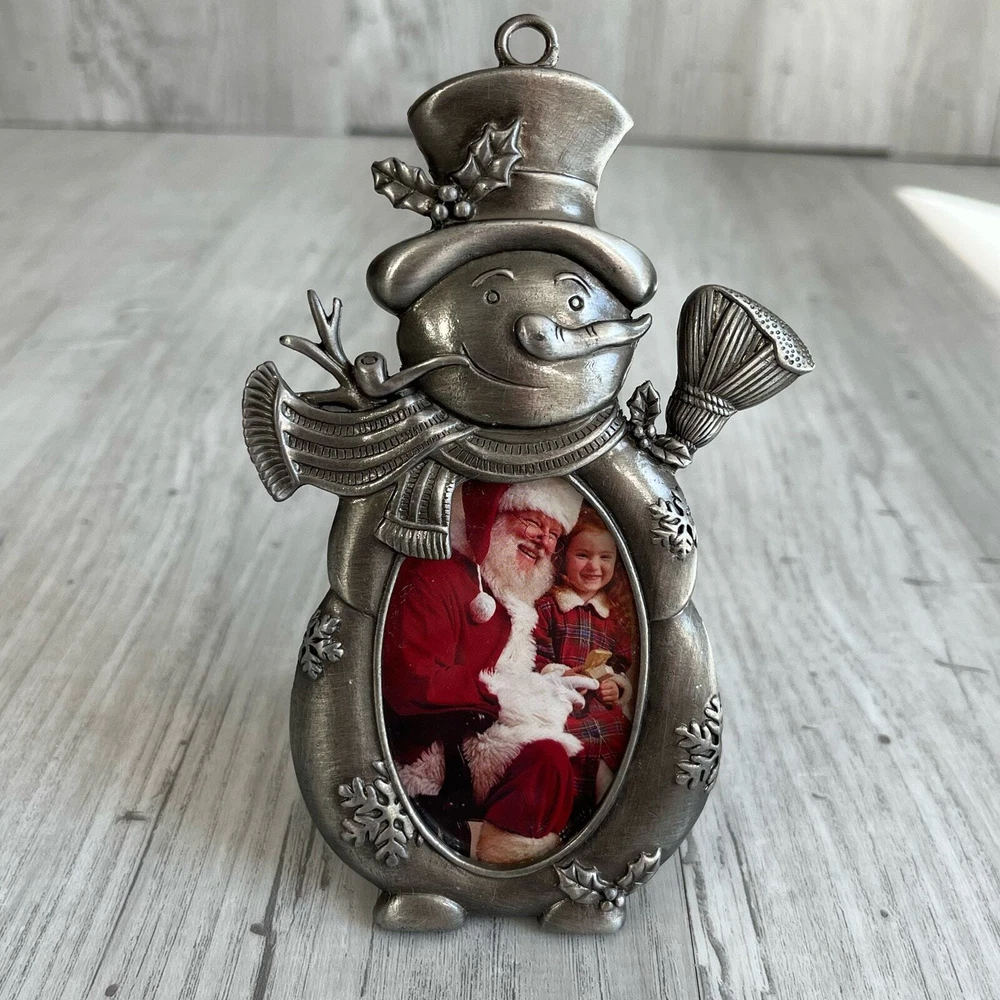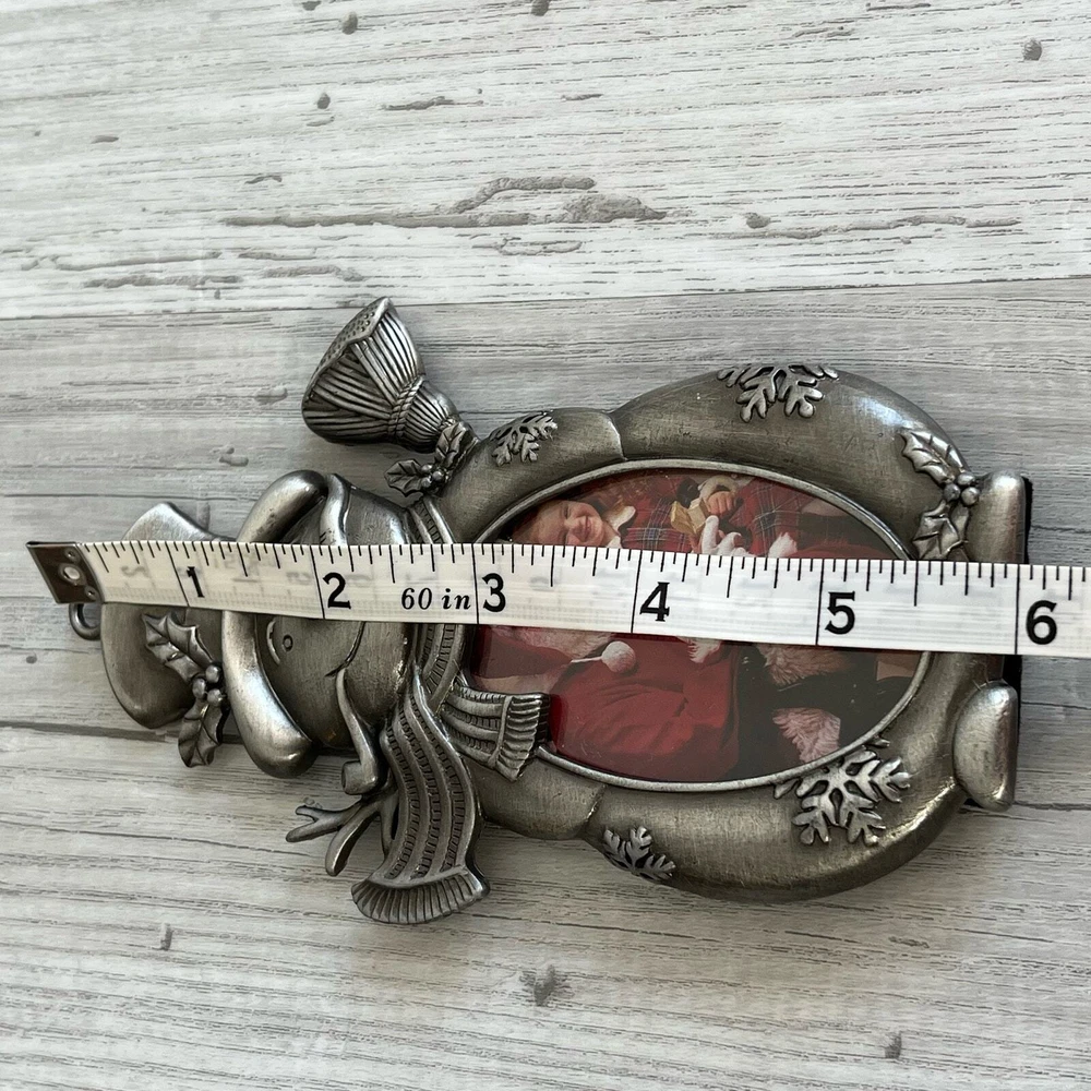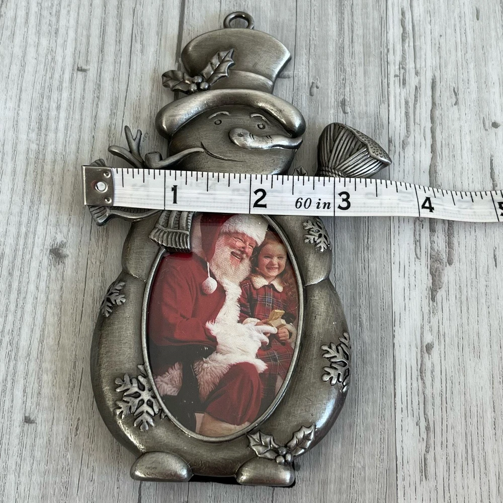Vintage Metal Silver Snowman Table Top Picture Frame or Hanging Ornament 6"x3" and holds a 2"x3" photo Can be used on a table or hanging Additional measurements available upon request All measurements are approximate All measurements are taken with item laying flat Double bust, waist, & hip for measurement all the way around Colors may differ based on others computer/phone/etc settings All pre owned items have been washed and steamed All pre owned items have been looked over for flaws and will be noted in listing