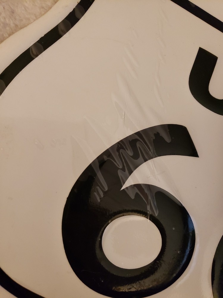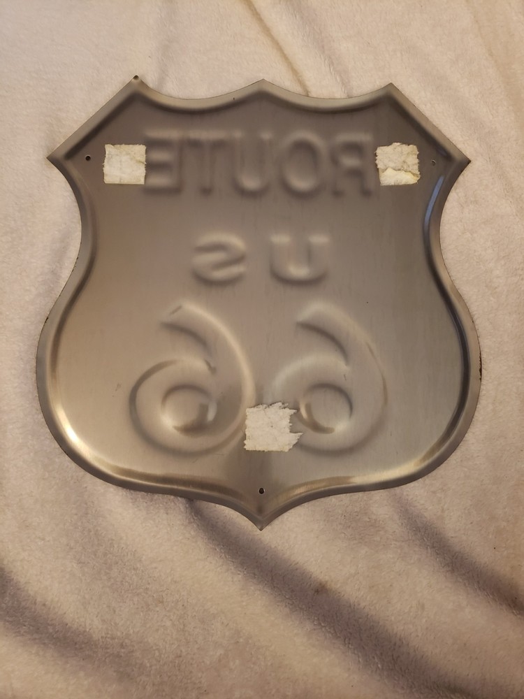 This Vintage Metal US Route 66 Road Sign measures 11" x 11 1/2" and is new in wrapped plastic, making it a perfect addition to any mancave or collection. The white sign features the iconic Route 66 branding and is a reproduction of the original advertising piece. Made in the United States, this sign captures the nostalgia and theme of gas & oil, making it a must-have for collectors of Route 66 memorabilia.