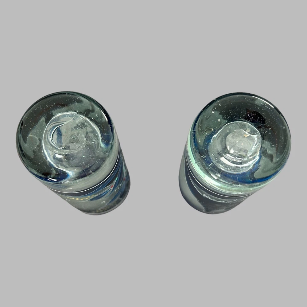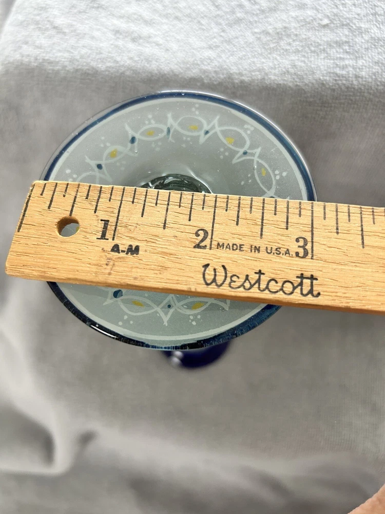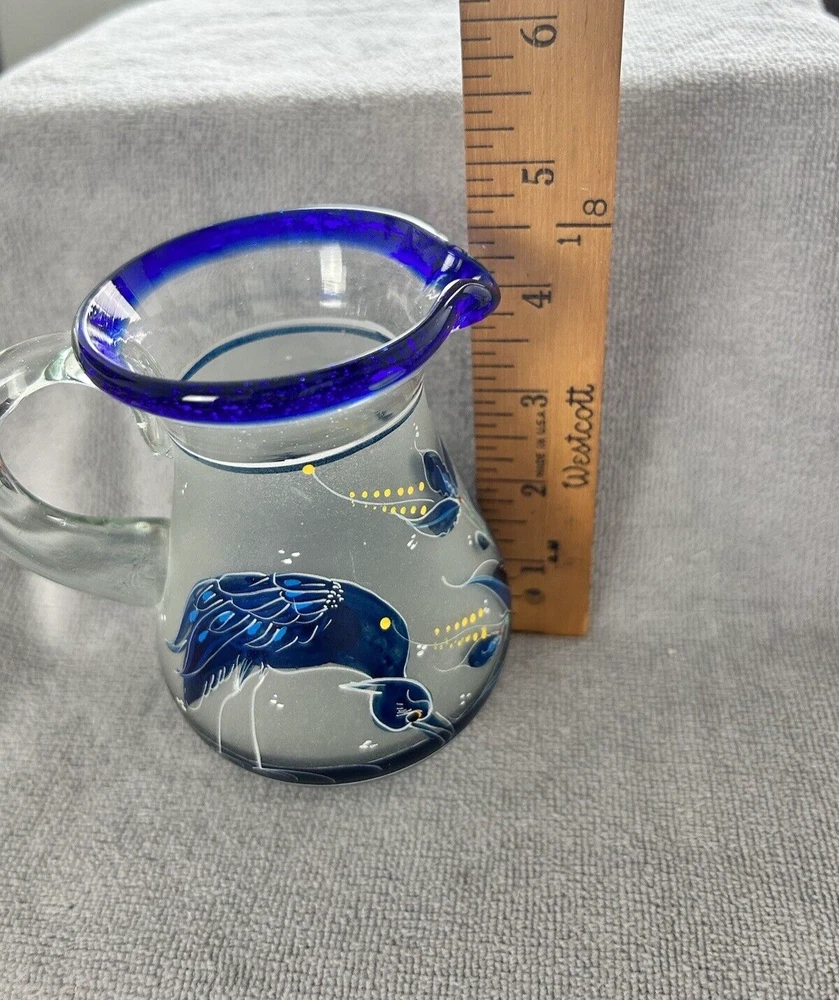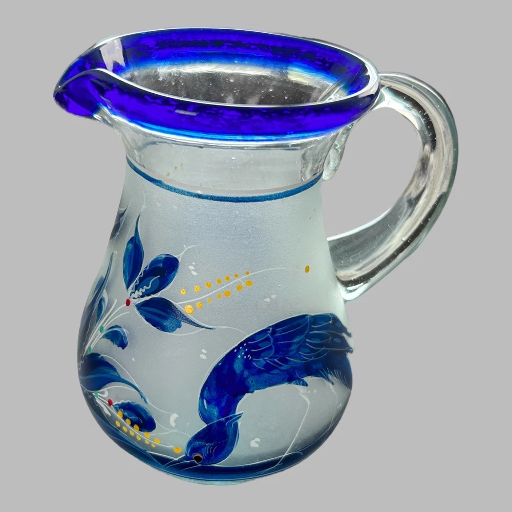 Add a touch of vintage style to your kitchen with this stunning four-piece glassware set. Featuring a beautifully hand-painted bird pattern in blue and frosted glass, this set includes a mini pitcher, two glasses, and a candlestick. Made of high-quality glass and crafted in Mexico, this set is both functional and decorative. Perfect for entertaining or as a thoughtful gift, this set is sure to impress. The mini pitcher and glasses are the perfect size for cordials or cocktails, while the candlestick adds a cozy touch to any table setting. With measurements included in the photos, you can be sure that this set will fit perfectly into your home décor.