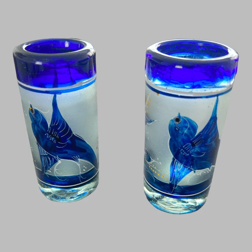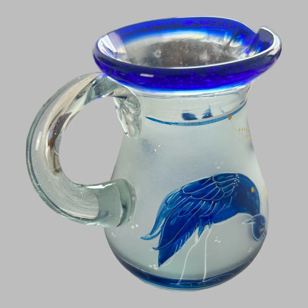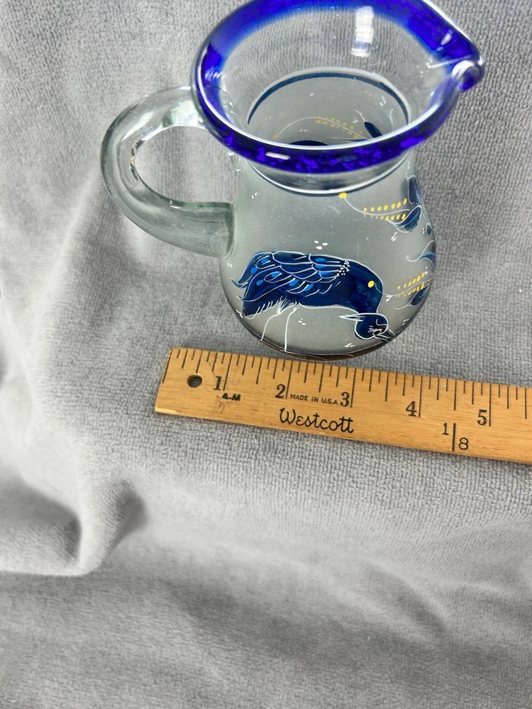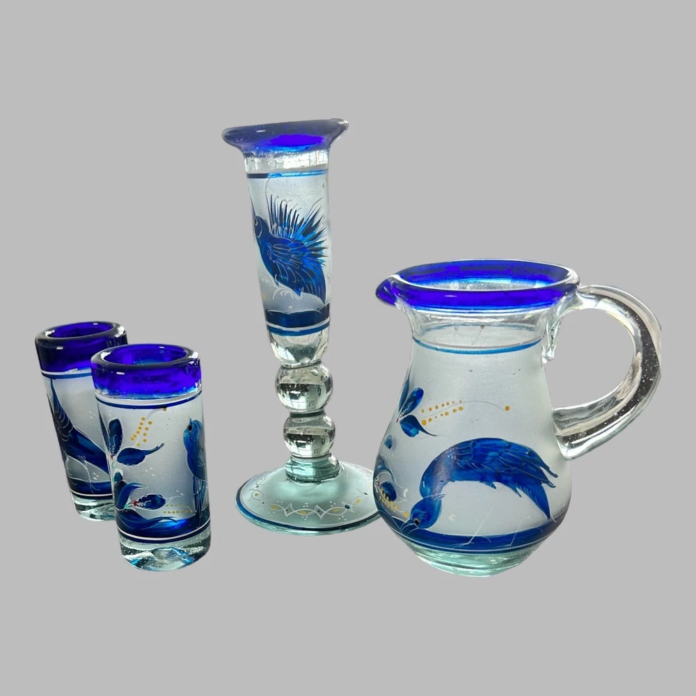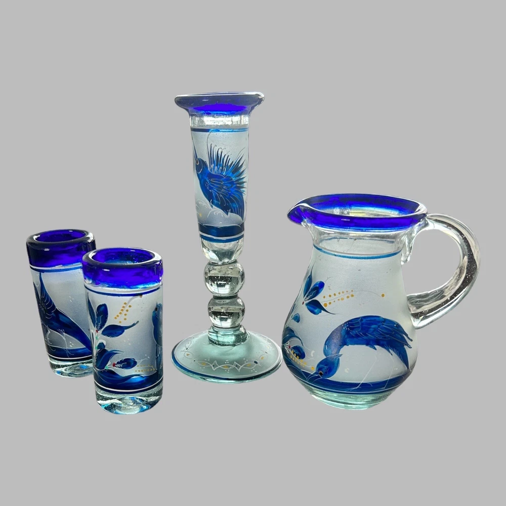 Department: Adults Pattern: Birds Service For: 2 Seller Notes: “excellent condition; no chips or cracks” Item Width: measurements in photos Personalize: No Number of Items in Set: Four-Piece Occasion: Cordials Set Includes: Mini Pitcher; 2 Glasses; Candlestick Features: Hand Painted, Frosted Item Weight: 2 lbs combined Color: Blue Theme: birds Item Height: measurements in photos Brand: Unmarked Country/Region of Manufacture: Mexico Type: mini pitcher; glasses; candlestick Glassware Type: Cordial Glass Material: Glass