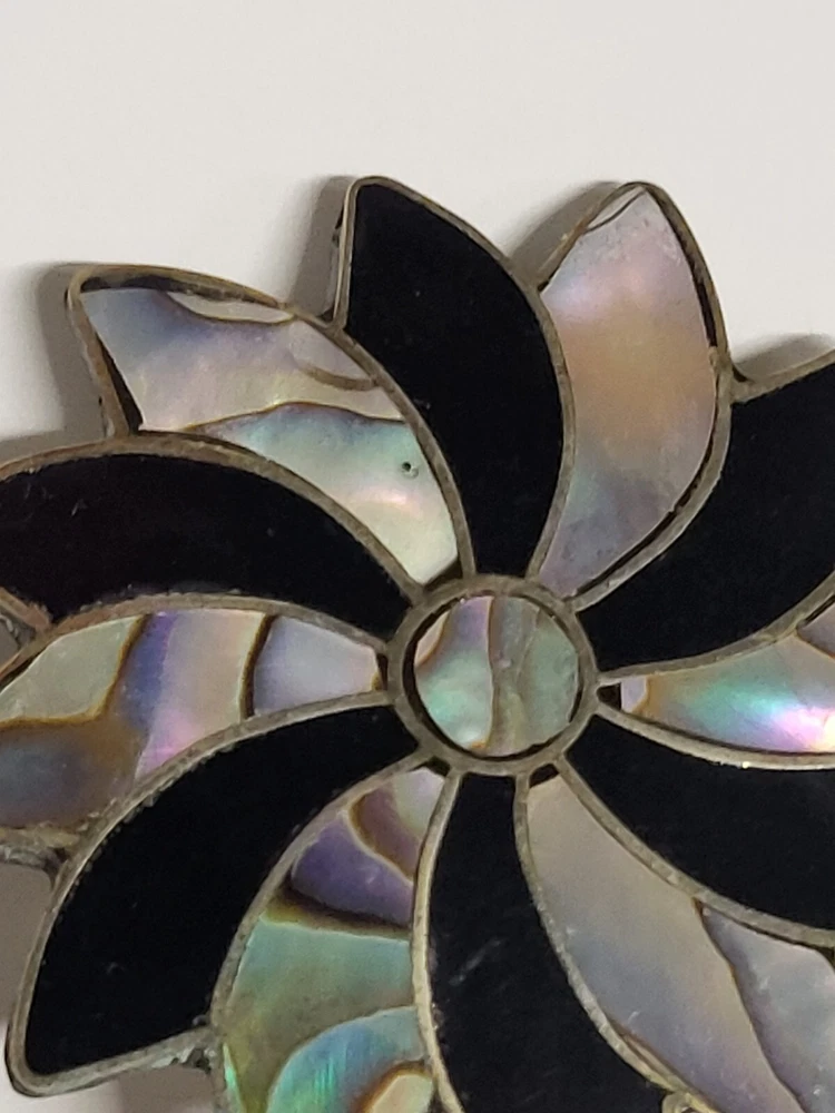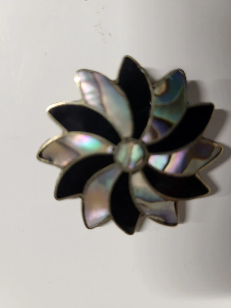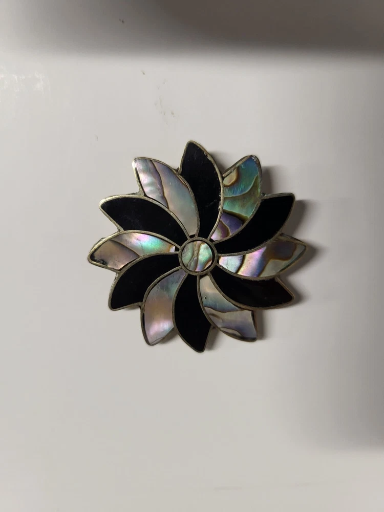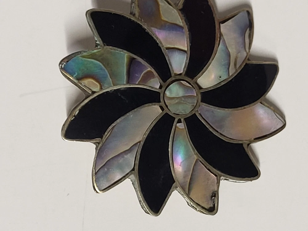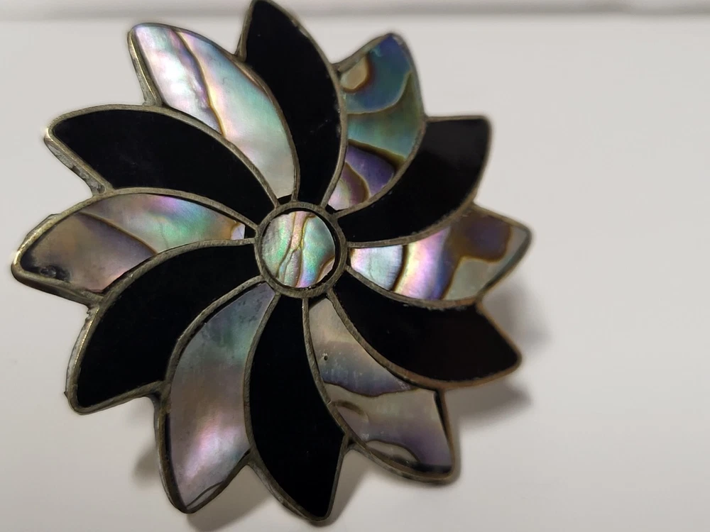 Vintage Alpaca Mexico 925 Silver Black Onyx & Abalone Shell Mother Of Pearl Pin Brooch. Pinwheel Star Design. Excellent Condition with Absolutely No damage.