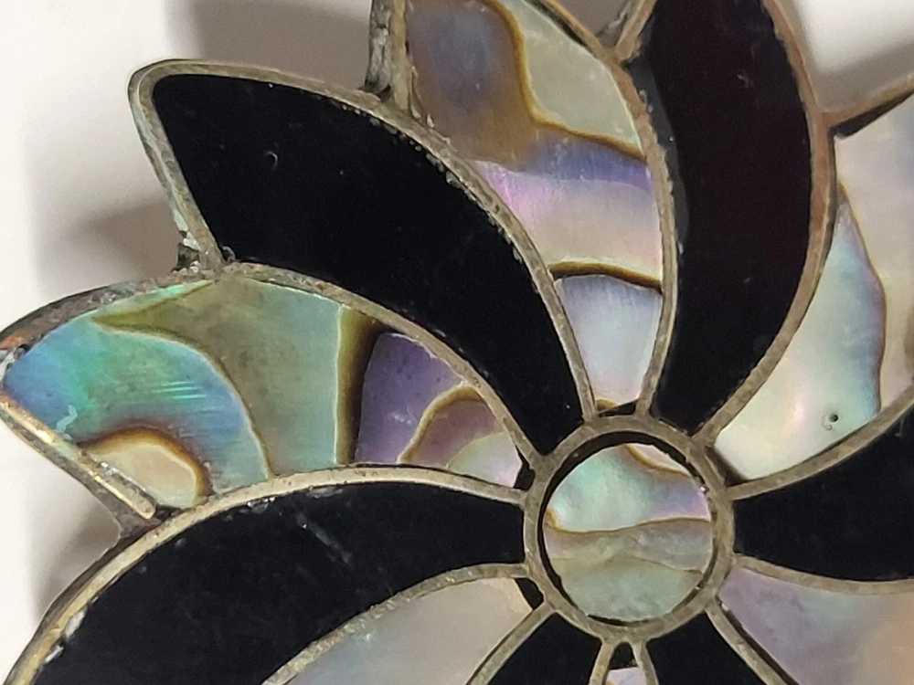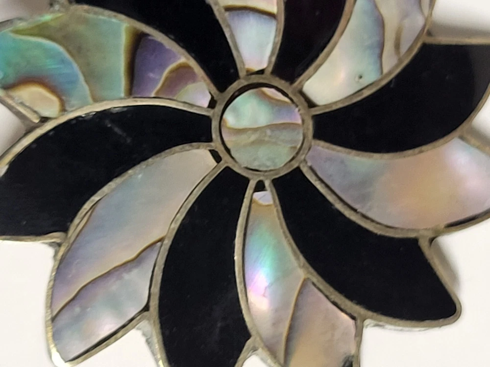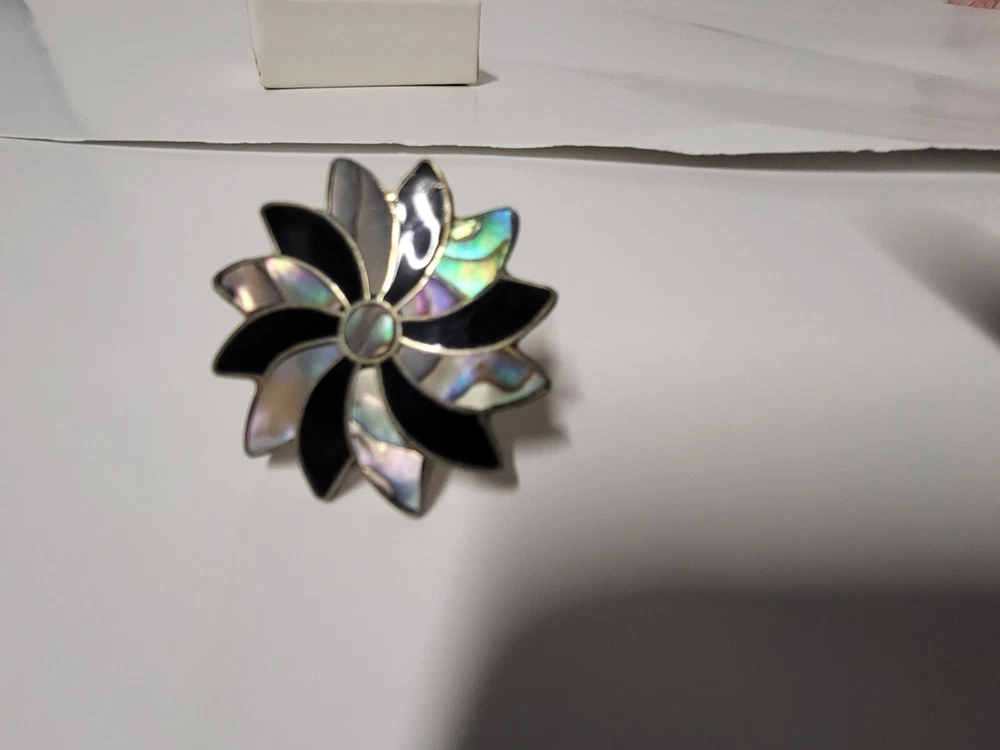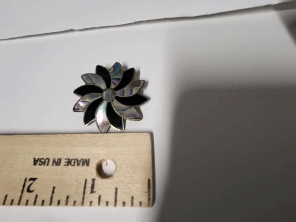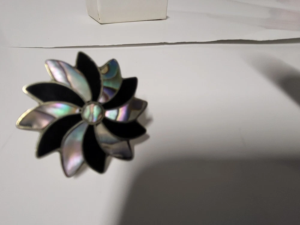 Vintage Alpaca Mexico 925 Silver Black Onyx & Abalone Shell Mother Of Pearl Pin Brooch. Pinwheel Star Design. Excellent Condition with Absolutely No damage.