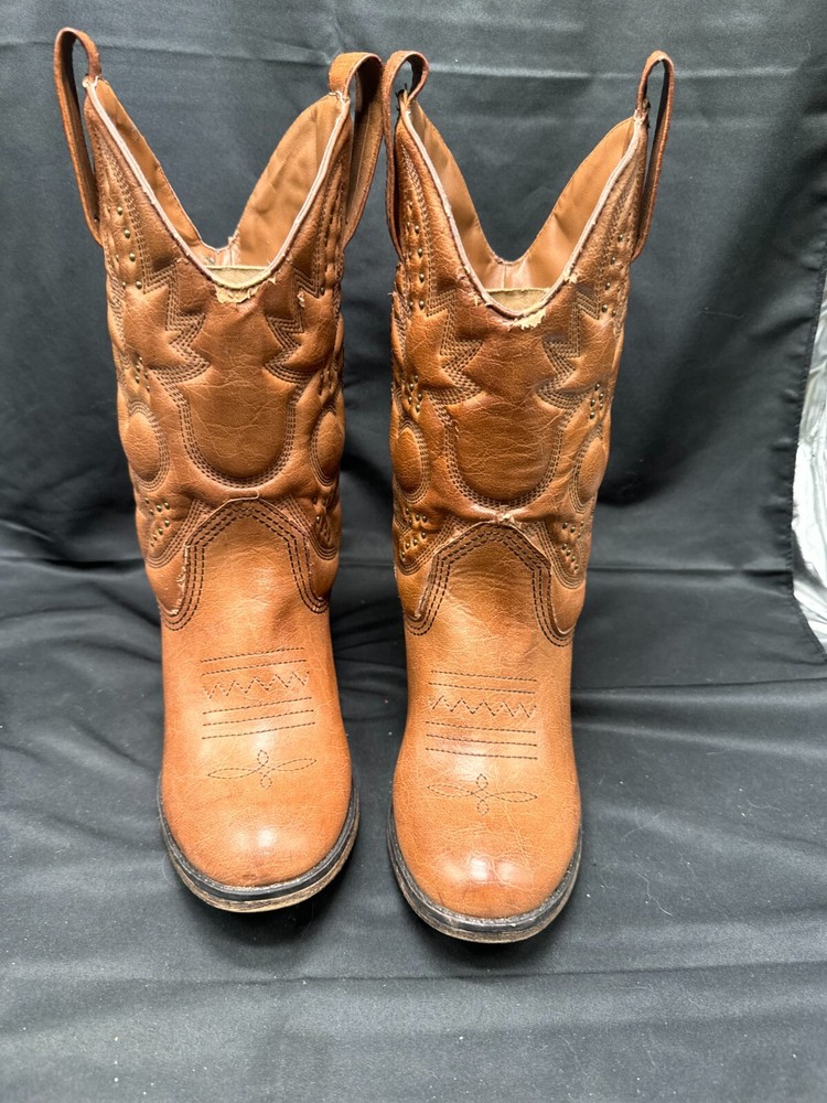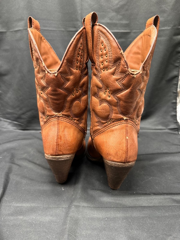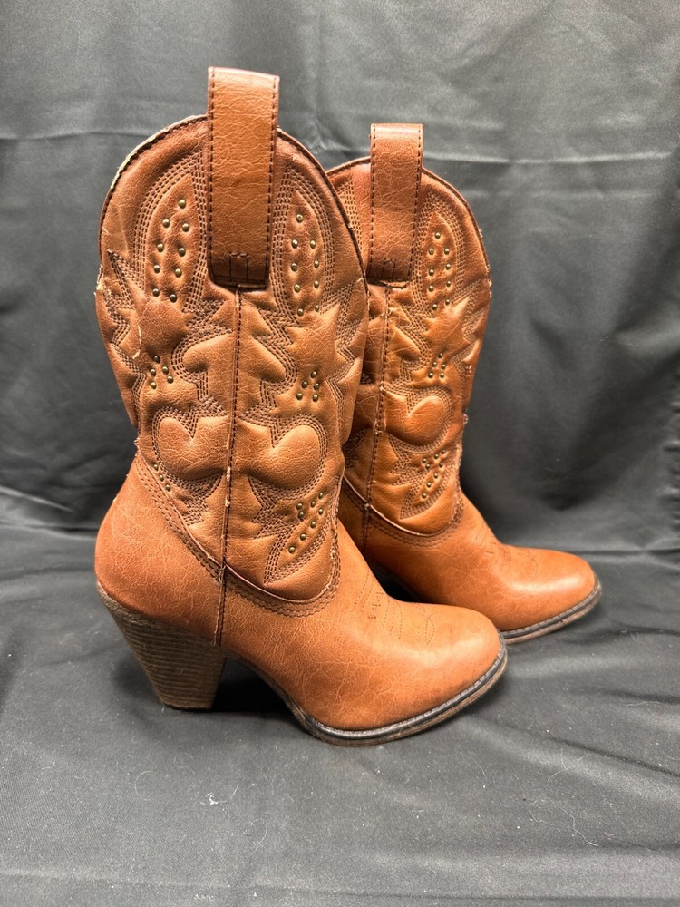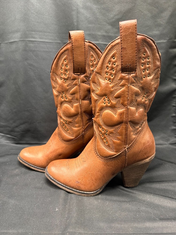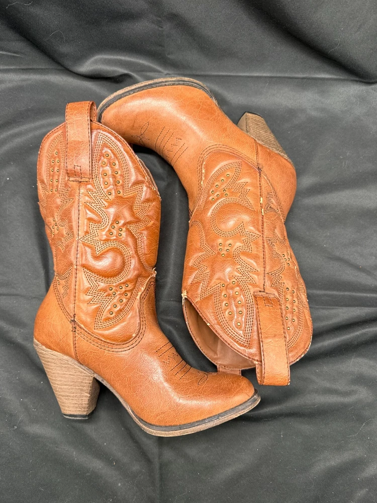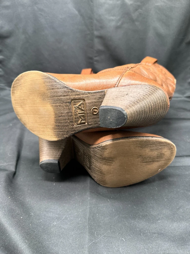 Vintage Mia Girl Larue Tan Western Faux Leather Heeled Cowgirl Boots Size 7 Step out in style with these vintage Mia Girl Larue cowgirl boots in a beautiful tan color. These boots are perfect for any fashion-forward woman who wants to add a touch of Western flair to her wardrobe. The boots feature a faux leather upper material, making them not only stylish but also durable. With a heeled design, these boots provide a comfortable fit for all-day wear. The boots are available in size 7 and are suitable for any occasion. Whether you're going for a casual look or dressing up for a night out, these boots are sure to make a statement. So, add these stunning boots to your collection today!
