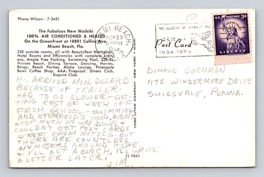 Vintage Miami Beach Waikiki Hotel FL Florida Advertising Postcard