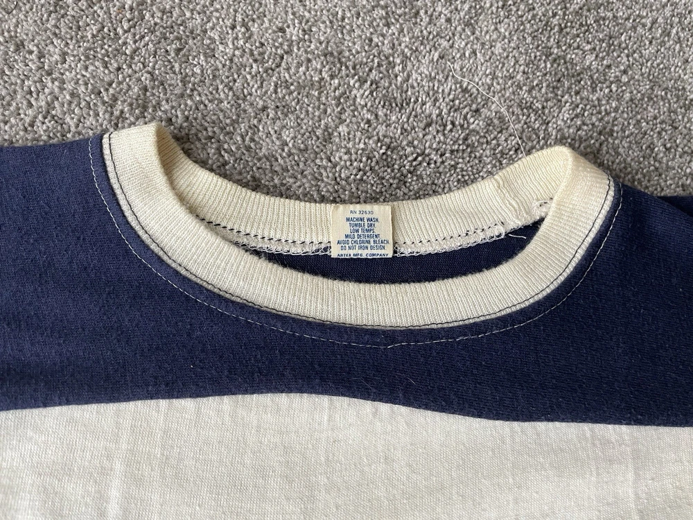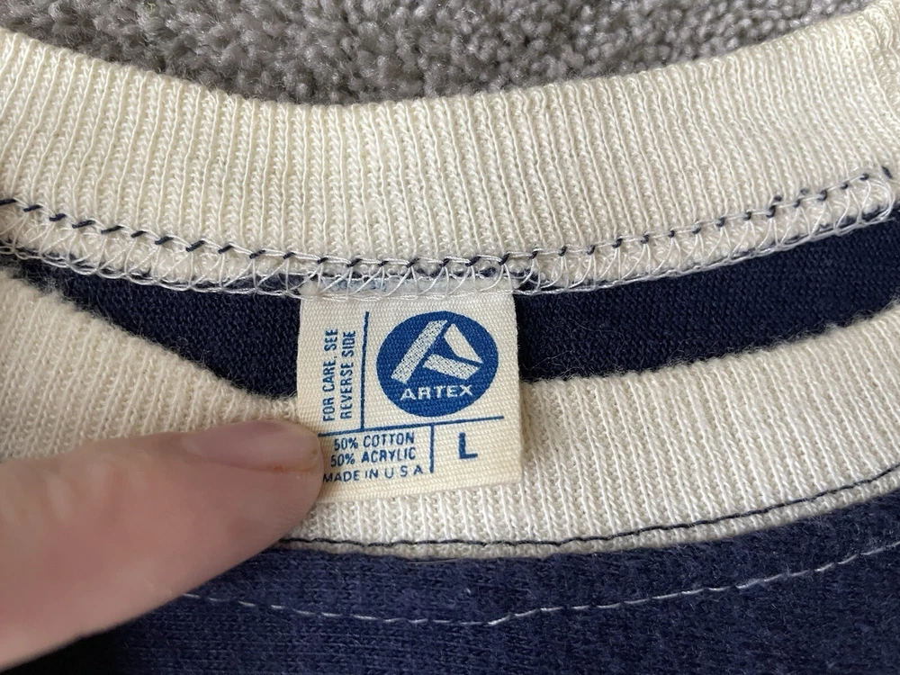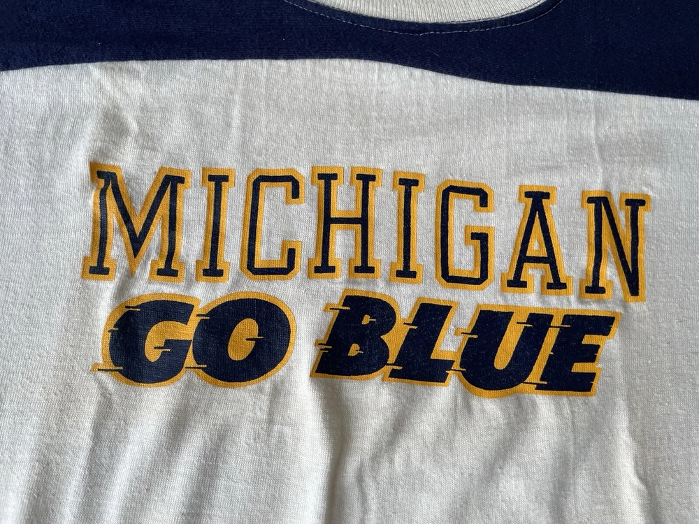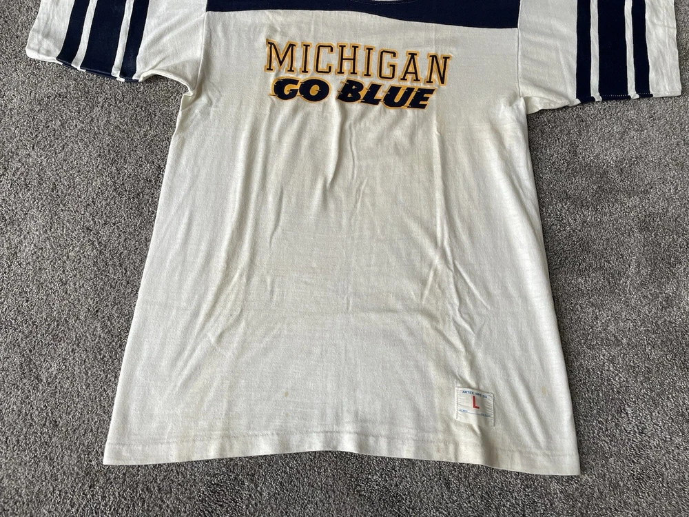 Embrace the spirit of the game with this vintage Michigan Wolverines shirt, a classic piece for any fan looking to celebrate their team's legacy. The shirt features a white color, complemented by blue accents that captures the essence of the Wolverines' pride. With a size large fit, it's tailored for comfort and style, making it a versatile addition to any fan's wardrobe. Crafted in the United States, this Artex apparel shirt is a nod to football fandom from the 1970s. It's a regular season staple that is perfect for showing support during the playoffs and beyond. Whether you're at the stadium or out and about, this shirt is a testament to your commitment to the Michigan Wolverines.