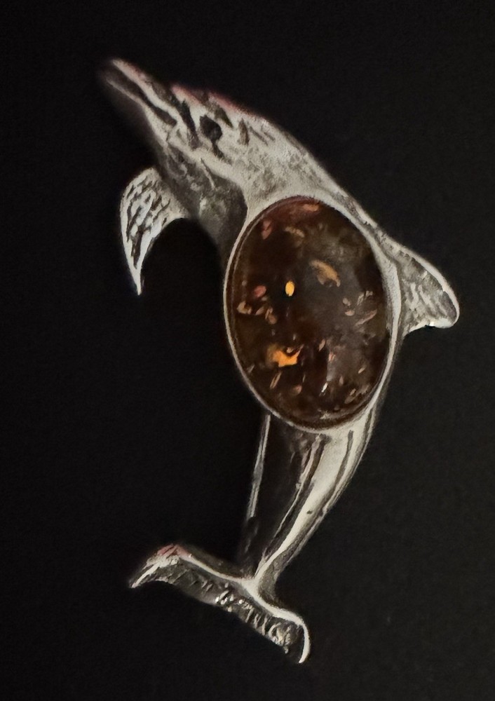 The Vintage Mod 10k White Gold Dolphin With Baltic Amber Jelly Belly Brooch is a rare and retro piece of jewelry that features a dolphin design with a Baltic amber Jelly Belly bead as the main stone. The brooch is made of gold and has a unique and classic charm that is sure to make a statement. This vintage piece is a one-of-a-kind find for collectors of retro jewelry and those who appreciate the beauty of natural Baltic amber.
