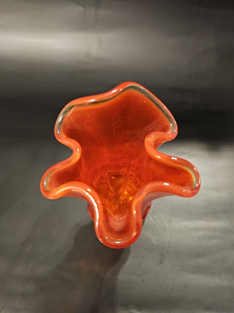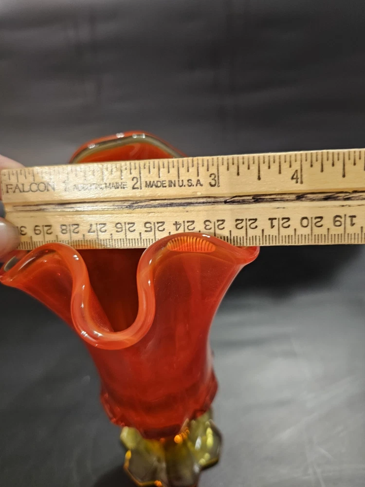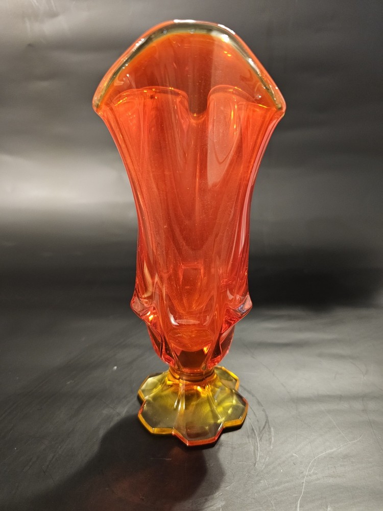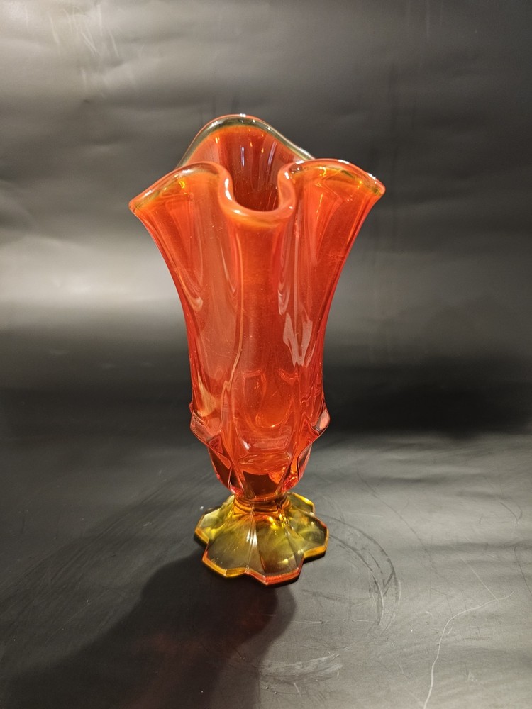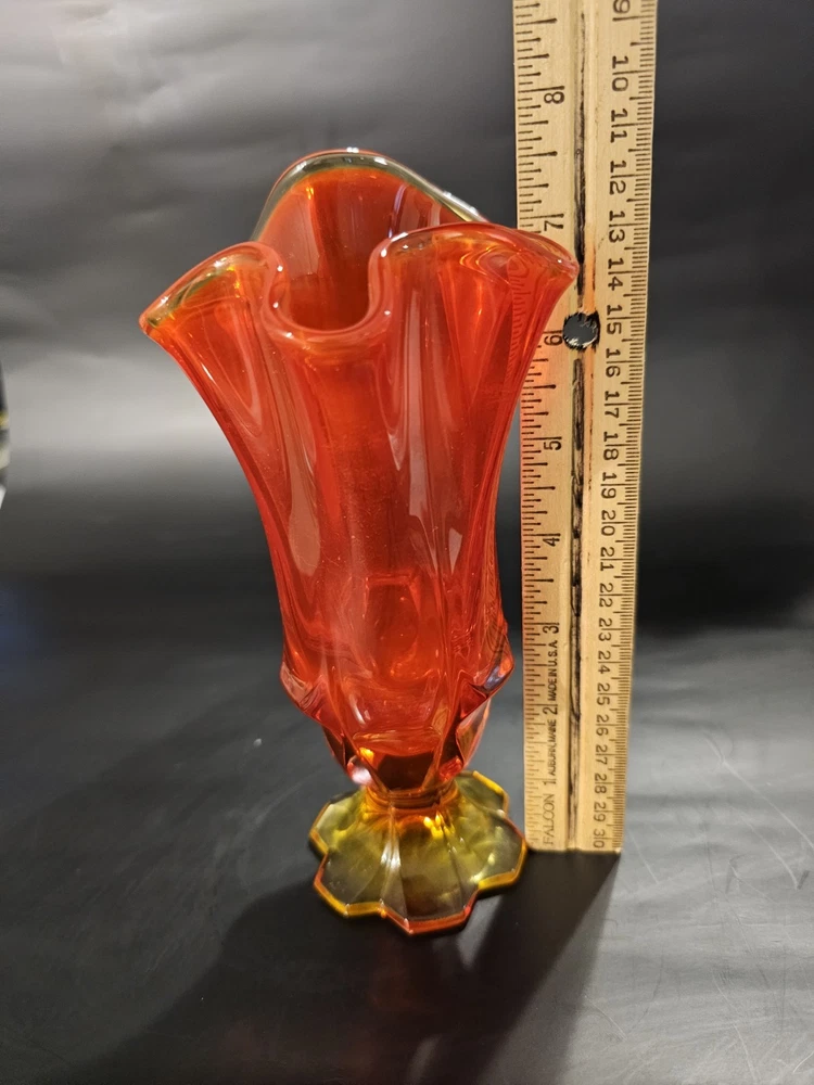 No chips or cracks. In great condition! The product is a vintage mid-century Fenton Amberina art glass pedestal handkerchief swung vase, made in America during the mid-20th century. The vase features a beautiful multicolor cabbage rose pattern, hand-blown glass production technique, and a decorative style typical of the mid-century modern era. This original Fenton piece is a unique and handmade addition to any art glass collection, showcasing the craftsmanship and design of the time.
