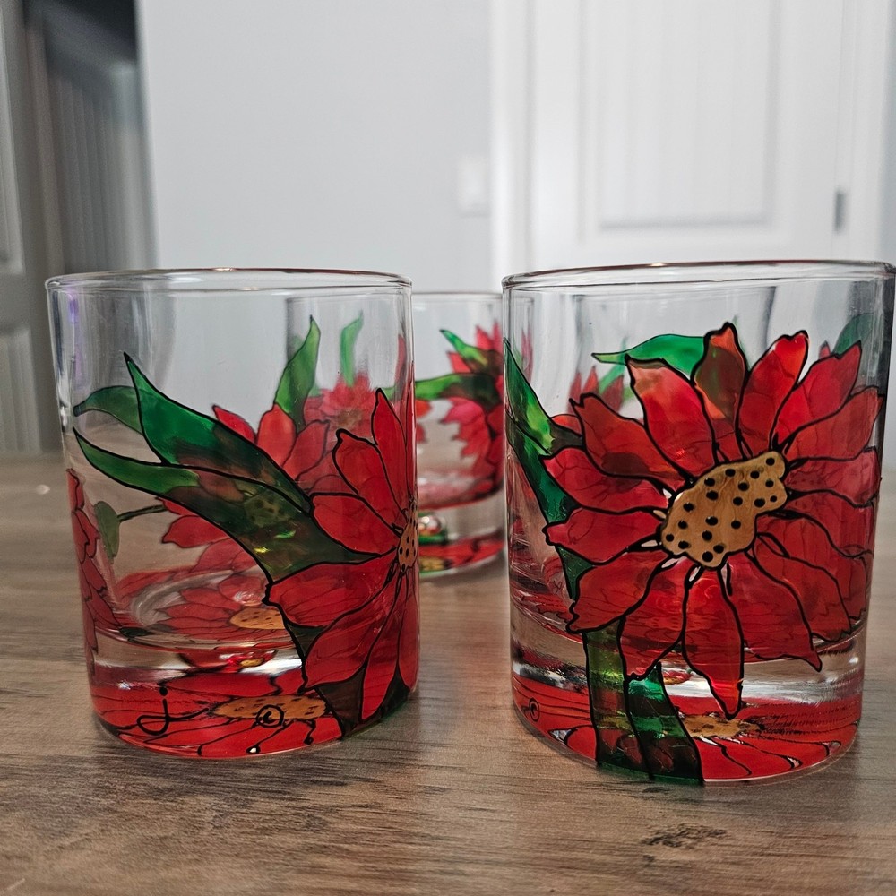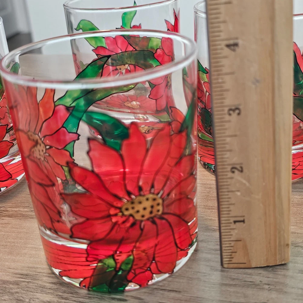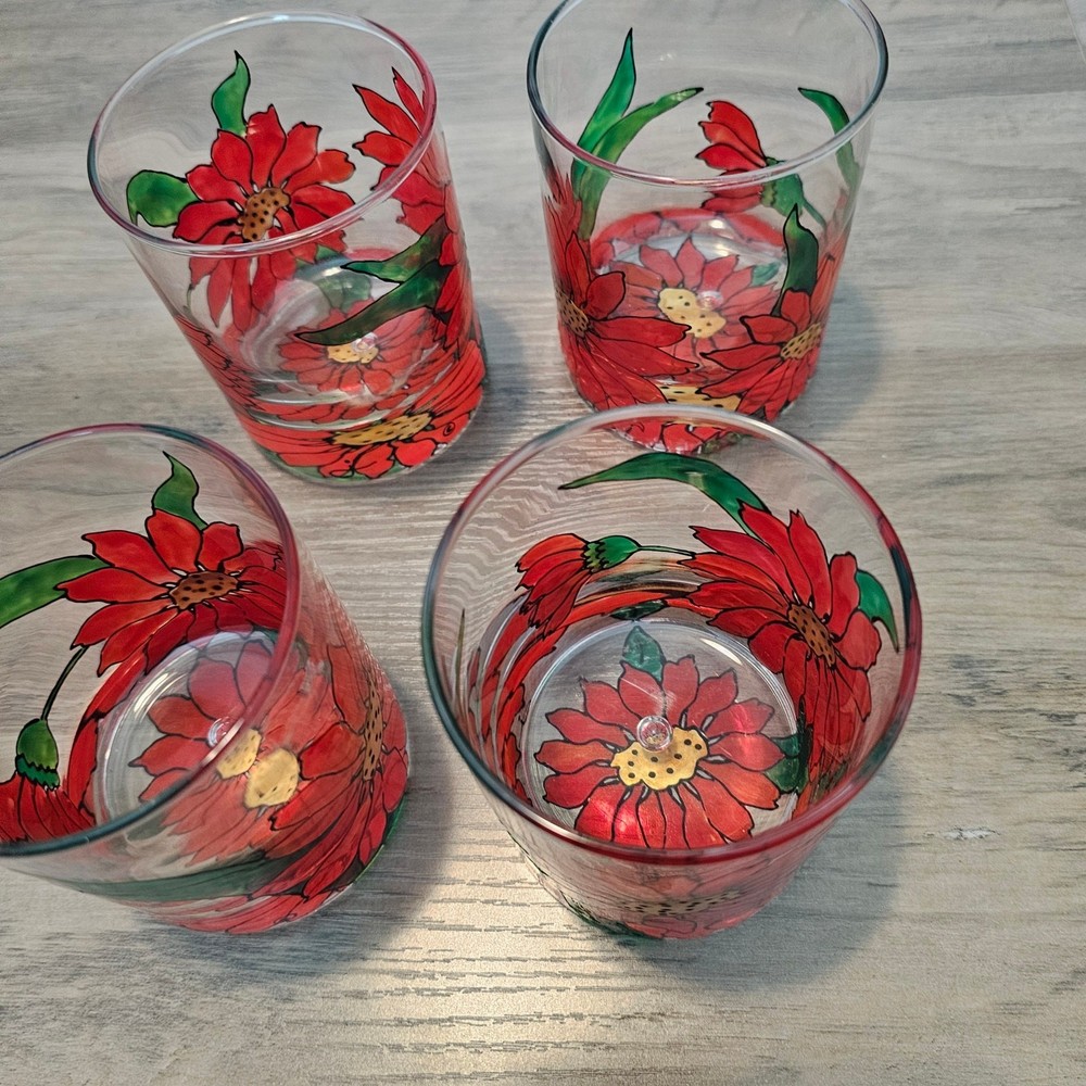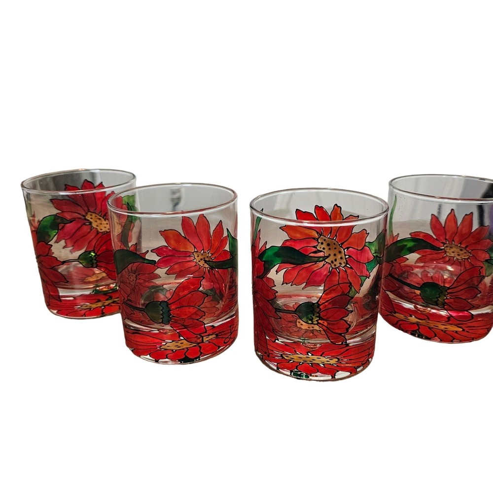 Vintage Hand Painted Poinsettia Glasses Set of 4 Drinking Glasses Mid Century -Excellent condition -Clear glass with hand-painted flowers all over, even on the very bottom -Flowers, Christmas, holiday, collectibles, glassware, MCM -Makers mark is signed on bottom front -Whiskey glass cup Measurements in photos. Same day / next day shipping Offers accepted Like for price drops and deals Bundle 2 items or more and save! Thank you! 4 lb