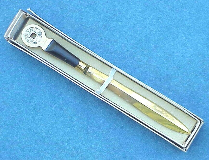 Vintage Mid Century Hollywood Regency 1960's Chinese Brass 7 3/4" long Lucky Coin Letter Opener in original Box, never used! Please check photos carefully, all my Items are either Estate, Vintage or Antique. Thanks for considering my listings today, I'll strive to exceed expectations on your Purchases. Please check my feedback of over 10300 positives, selling for over 27 years on ebay, before that the rest of my life :^). Hope you will check and bookmark my Auctions for new items listed daily! International Buyers are responsible for VAT, Customs or Import Fees.
