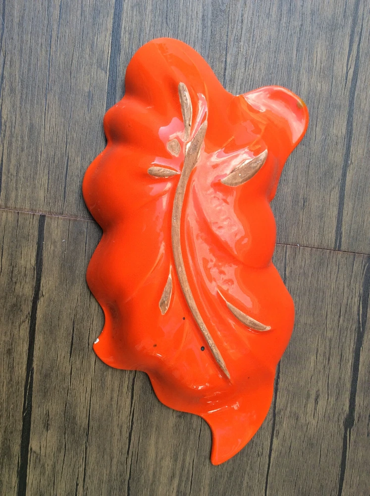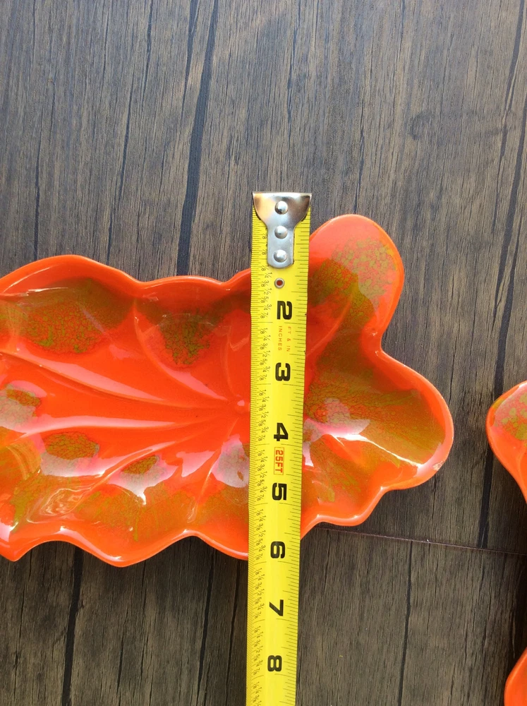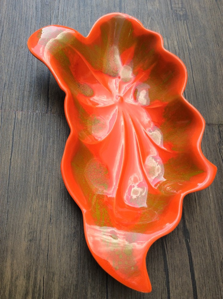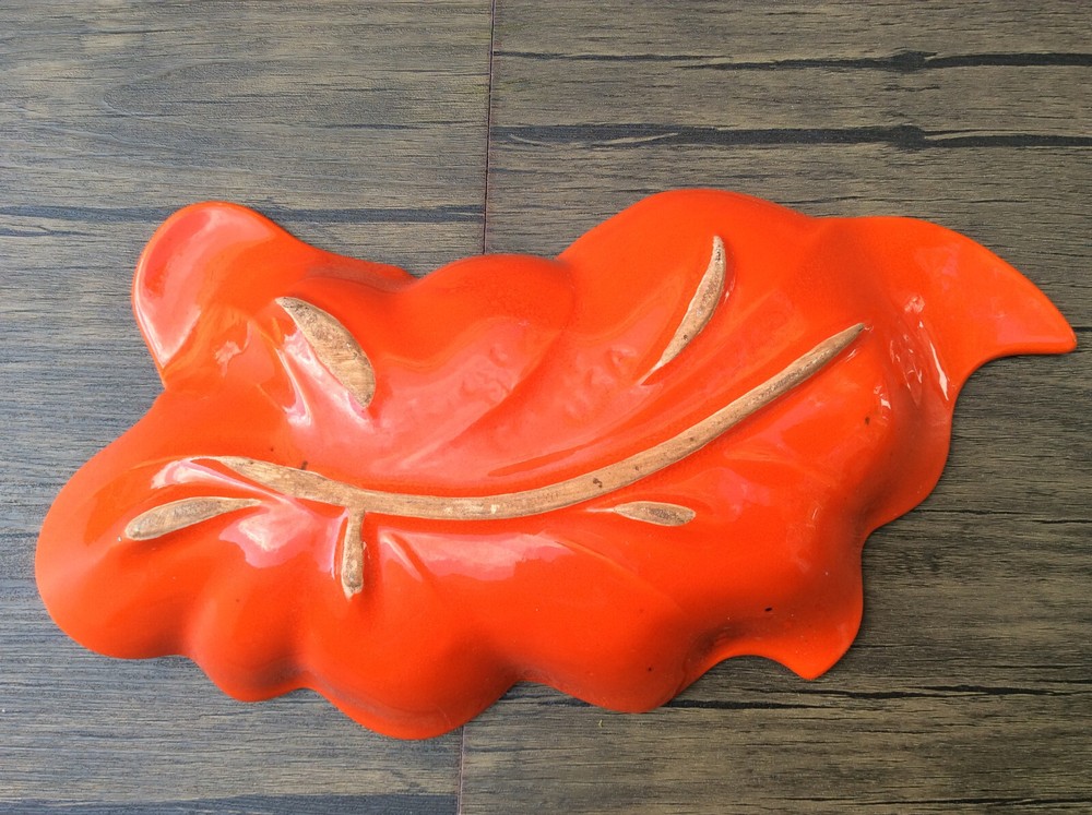 These stunning vintage leaf dishes bring mid-century charm to any space! The rich orange and gold glaze catches the light beautifully, and the handcrafted details make them true conversation pieces. Perfect for display or serving, their organic shape and glossy finish add a warm, artistic flair. Love the California craftsmanship—such a unique find!