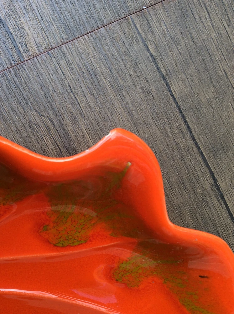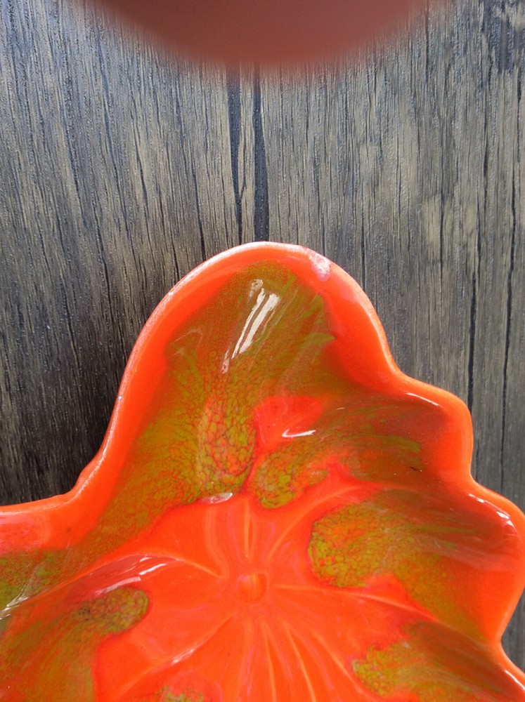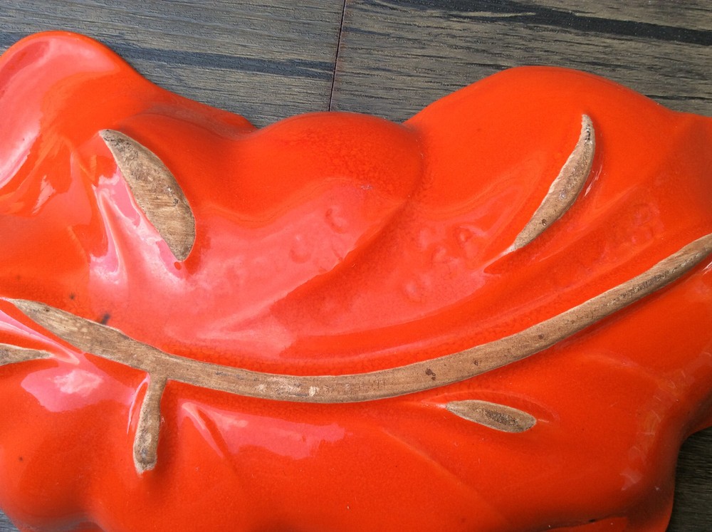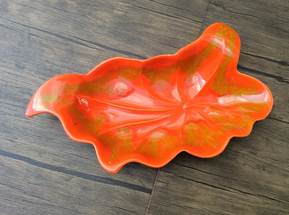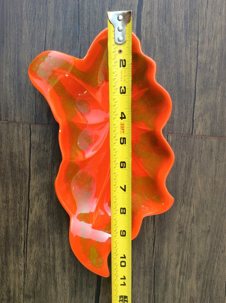 These stunning vintage leaf dishes bring mid-century charm to any space! The rich orange and gold glaze catches the light beautifully, and the handcrafted details make them true conversation pieces. Perfect for display or serving, their organic shape and glossy finish add a warm, artistic flair. Love the California craftsmanship—such a unique find!