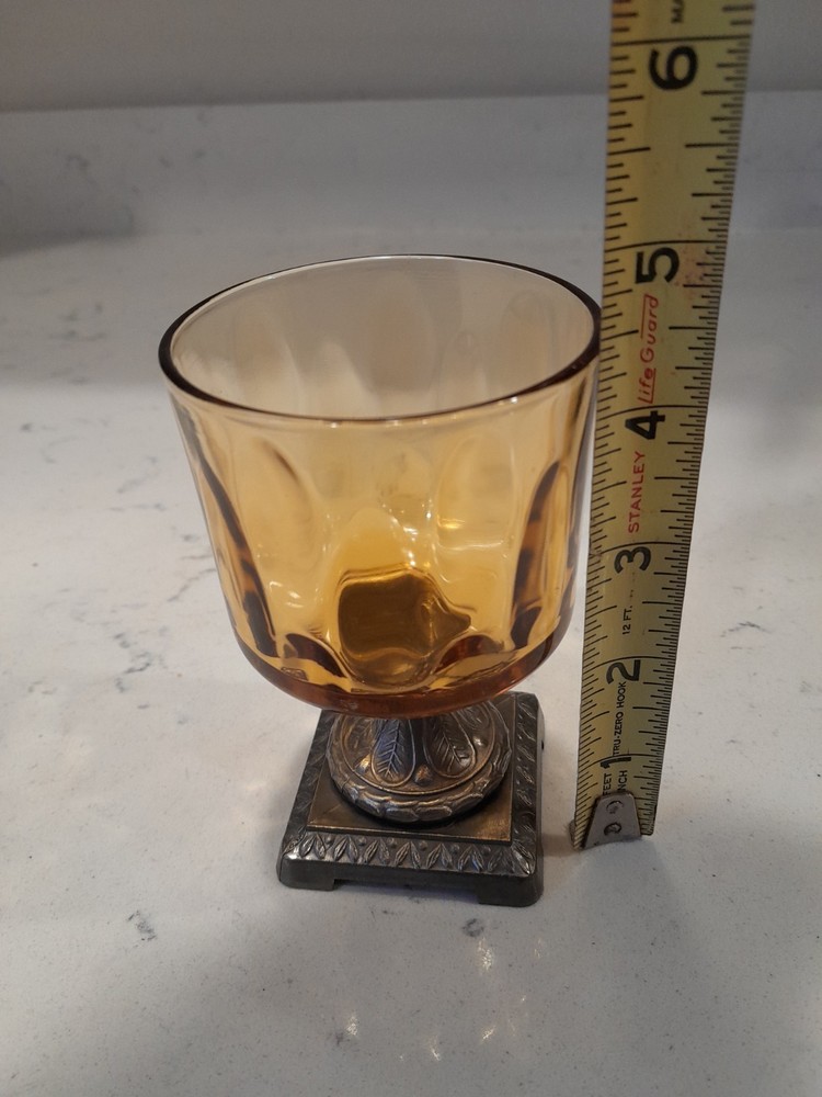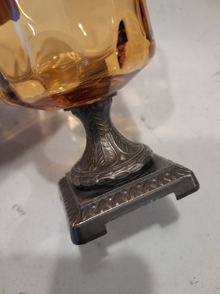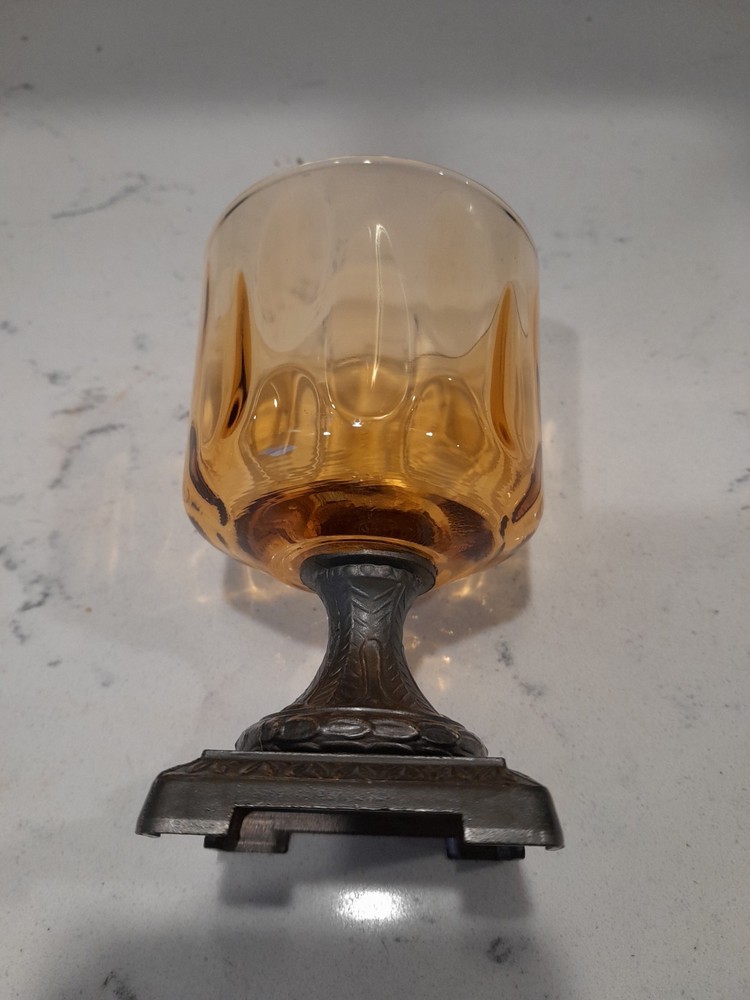 This Vintage MCM Cast Brass & Amber/Gold Glass Votive Tea Light/Candle Holder exudes a 1960s bohemian style with its art nouveau design, featuring an all-over pattern and a gold finish. Made of brass and glass, this candle holder is versatile for both indoor and outdoor use, making it suitable for any occasion. The unboxed and retired piece adds a unique touch to any home decor collection, reflecting the retro charm of the era. Beautiful Condition