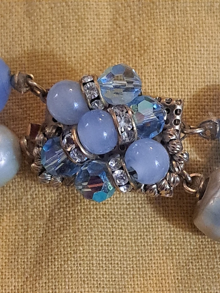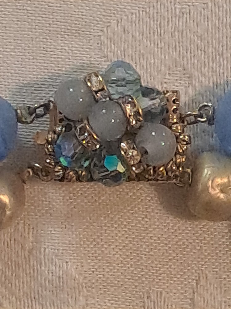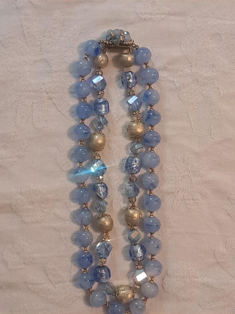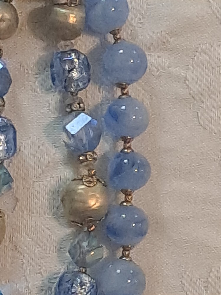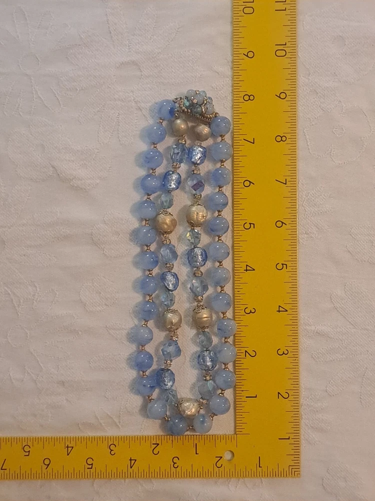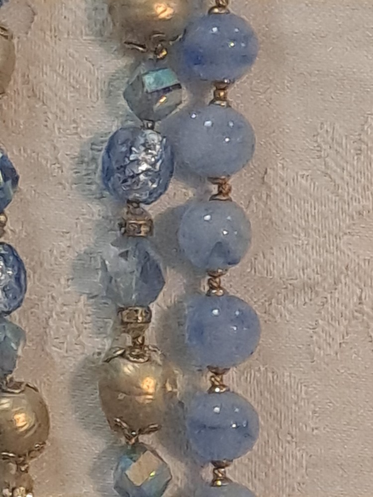 This vintage mid-century glass beads necklace features a stunning array of blue tones, making it a standout piece of jewelry. The necklace is composed of glass beads in various shades of blue, accented with gold tones. The beaded style adds a touch of elegance, while the box closure ensures a secure fit. Despite not being signed, the necklace exudes a classic charm that is perfect for vintage enthusiasts looking to add a unique and eye-catching piece to their collection. There is one broken glass bead that is not noticeable. There is a picture of it. This necklace is stunning!