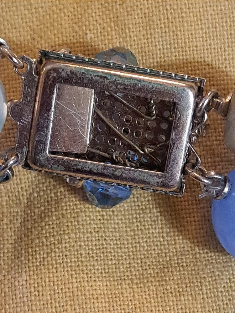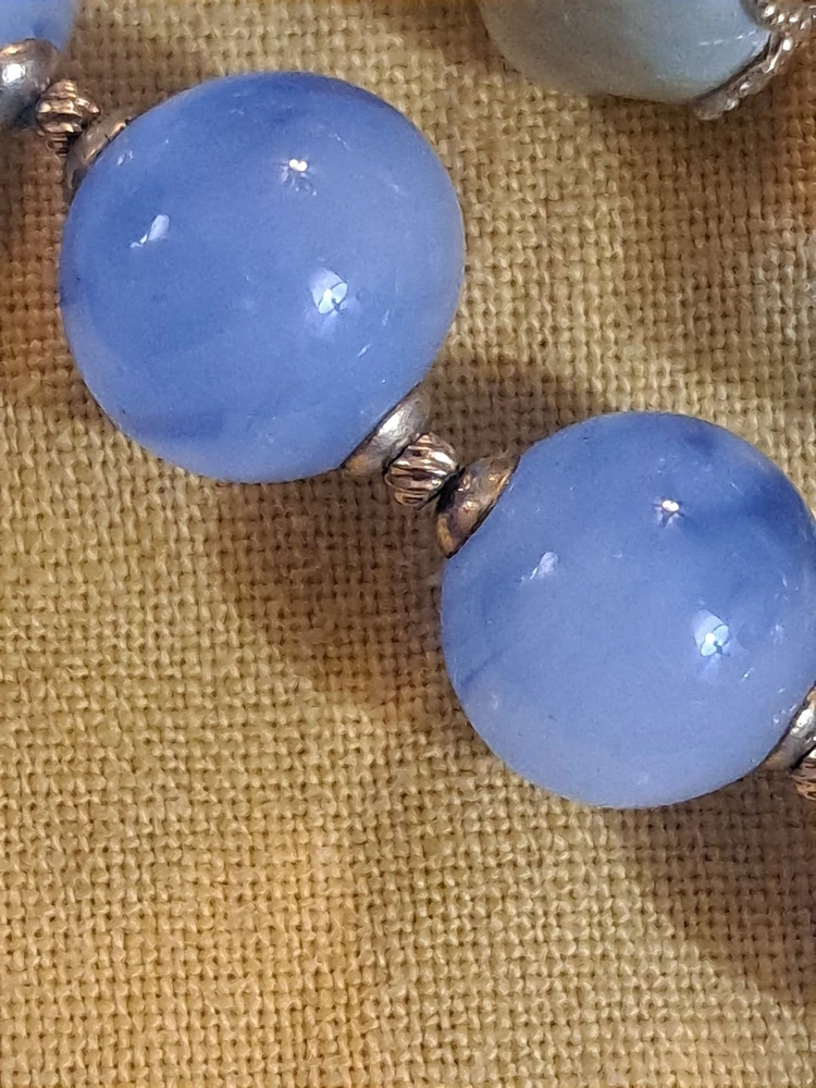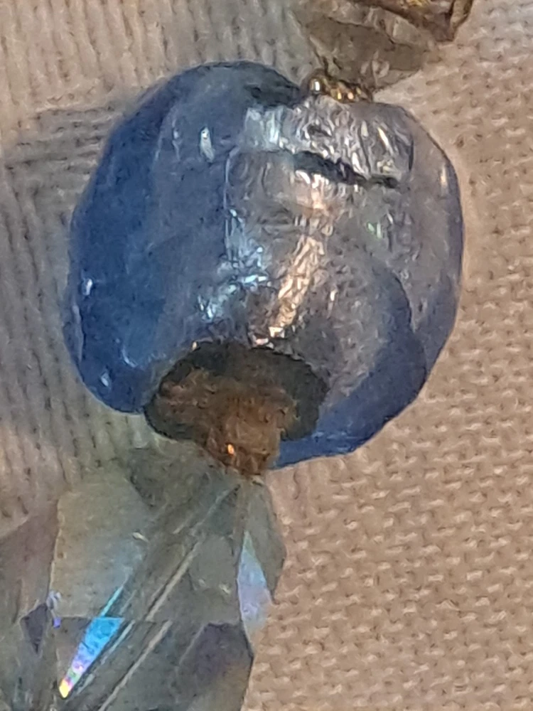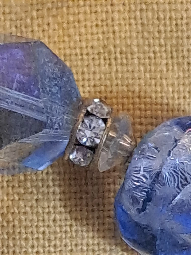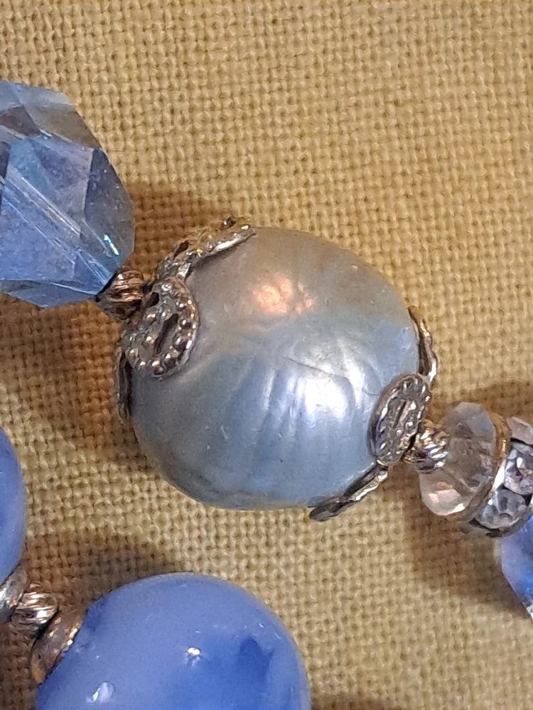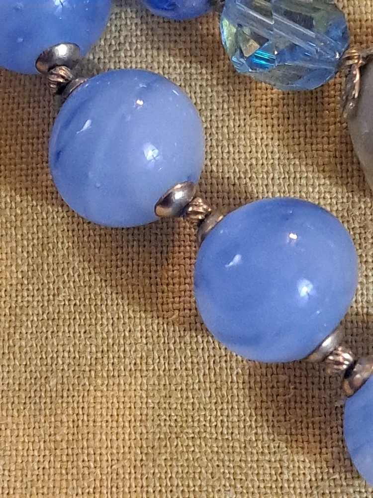 This vintage mid-century glass beads necklace features a stunning array of blue tones, making it a standout piece of jewelry. The necklace is composed of glass beads in various shades of blue, accented with gold tones. The beaded style adds a touch of elegance, while the box closure ensures a secure fit. Despite not being signed, the necklace exudes a classic charm that is perfect for vintage enthusiasts looking to add a unique and eye-catching piece to their collection. There is one broken glass bead that is not noticeable. There is a picture of it. This necklace is stunning!